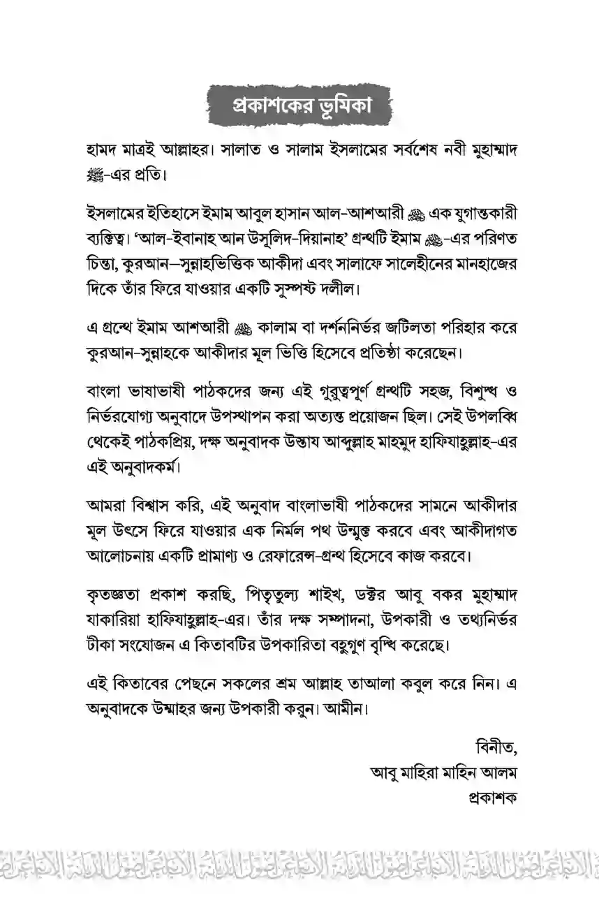 “আল-ইবানাহ” ইমাম আশআরীর পরিণত চিন্তার প্রতিফলন; এখানে তিনি আহলুস সুন্নাহ ওয়াল জামাআহর আকীদাকে কুরআন-সুন্নাহর আলোকে প্রতিষ্ঠা করতে চেয়েছেন। বইটির বিশেষত্ব হলো—এটি কেবল তাত্ত্বিক আলোচনা নয়; বরং দলীল, ইজমা, সালাফের বুঝ আর যুক্তিসঙ্গত খণ্ডনের মাধ্যমে পাঠককে আকীদার শক্ত ভিতের সাথে যুক্ত করে।