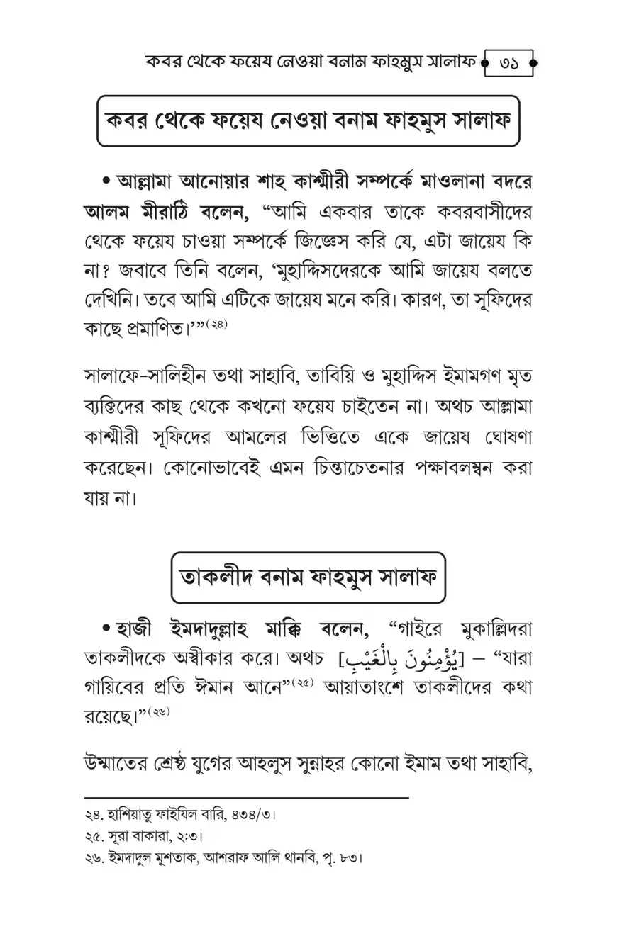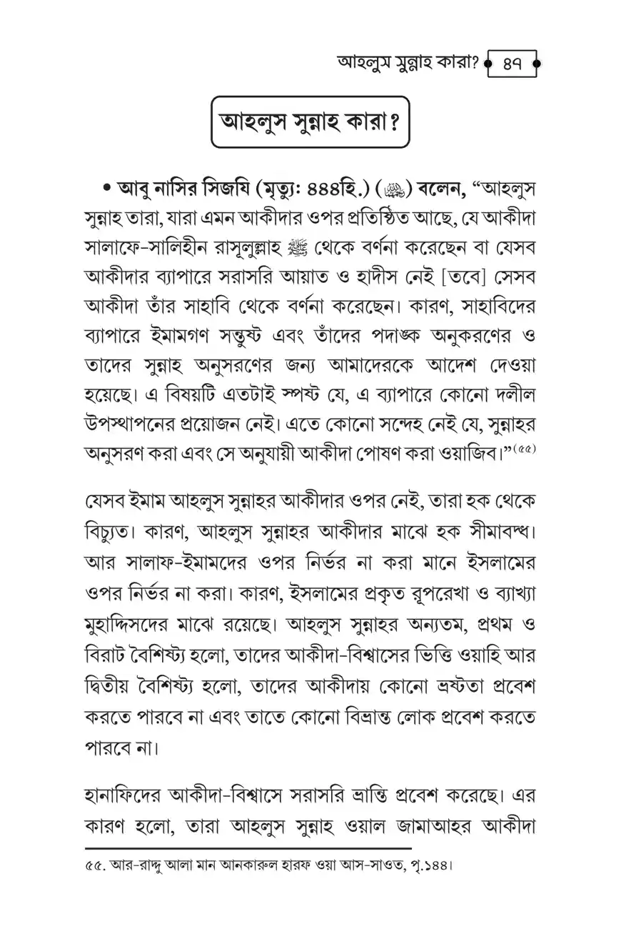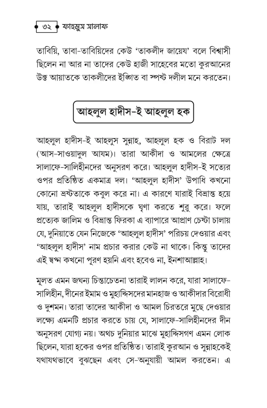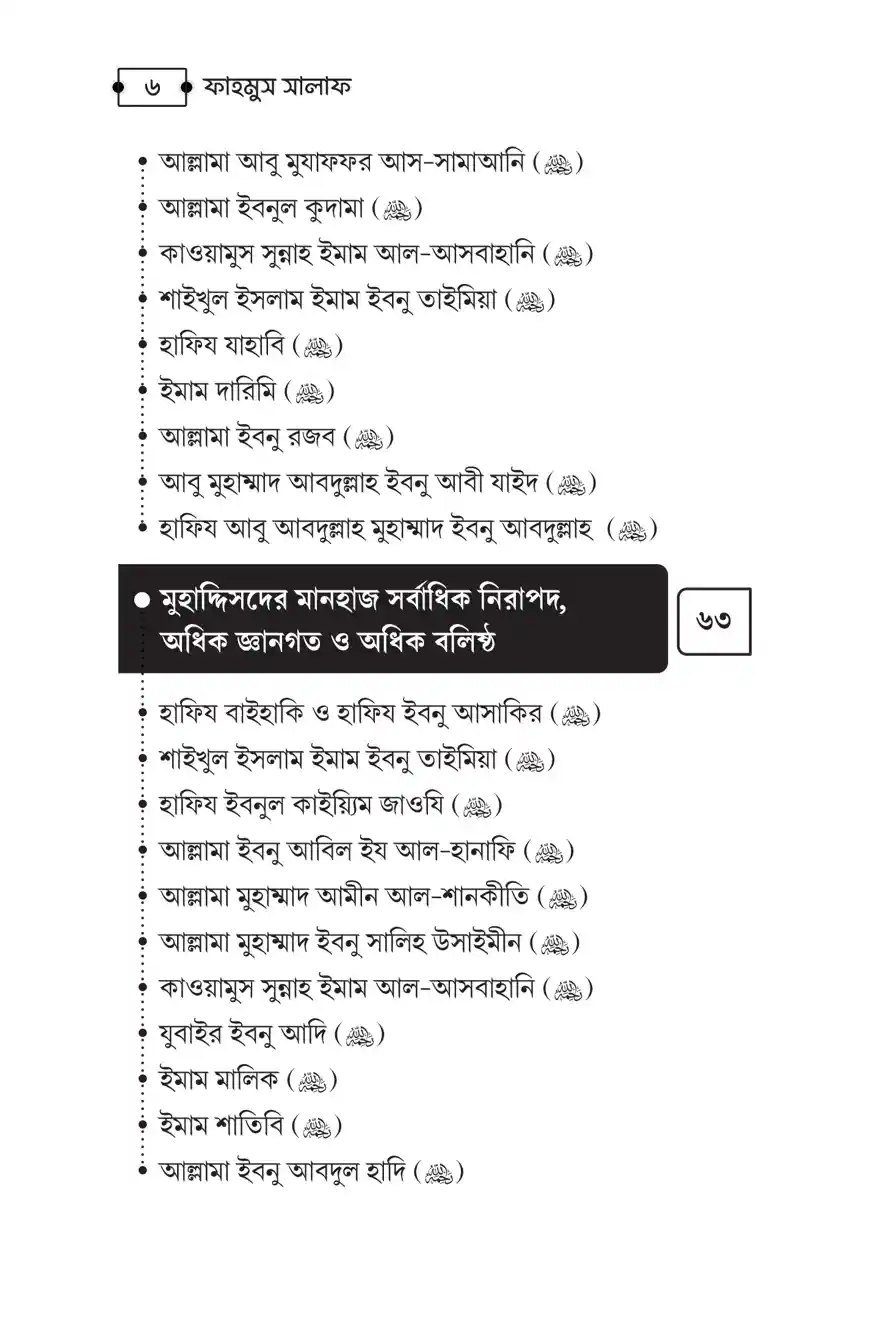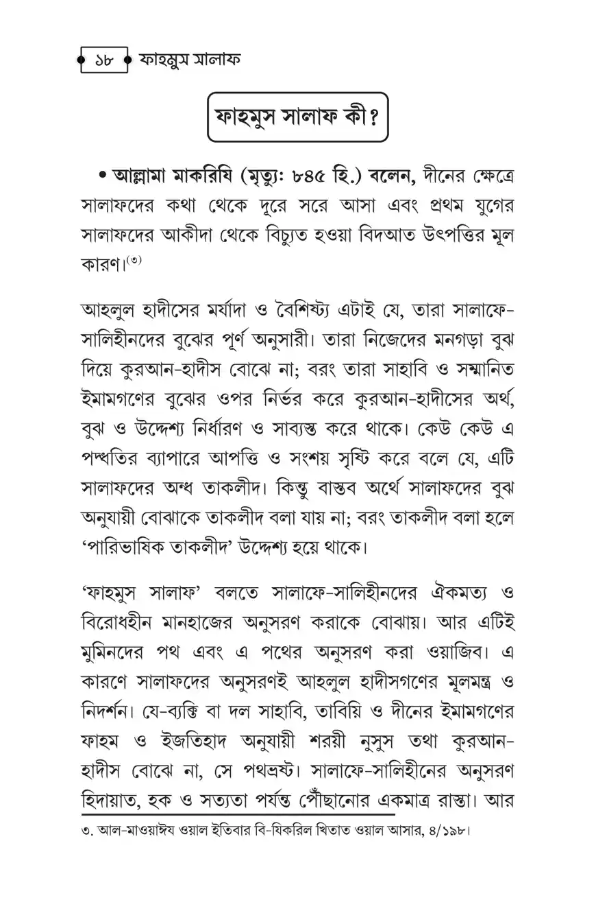ইসলামের নামে প্রচলিত সব দল থেকে ‘সীরাতুল মুস্তাকীম’ অনুসন্ধানকারী মুসলিম কীভাবে ‘সরল পথ’ খুঁজে পাবে? ওই ‘সরল পথ’-টা বোঝা ও যাচাইয়ের কষ্টিপাথর হলো ‘ফাহমুস সালাফ’। যত ভ্রান্ত দল,মত,পথই থাকুক সবই ‘সালাফগণের বুঝের’ কাছে ধরা পড়বে। কুরআন ও হাদীস নিজেদের মনোমতো ও নিজেদের বুঝমতো বুঝলে হবে না। বরং সালাফগণের বুঝ মতোই বুঝতে হবে। যে বুঝ নবি ﷺ-এর সাহাবিগণ বুঝেছিলেন,যা বুঝেছিলেন তাবিয়ি ও তাবা-তাবিয়িগণ। কুরআন ও হাদীসের ‘মতন’ বা ‘মূল বক্তব্য’-কে সেভাবে বুঝলেই আপনি সর্বযুগে,সর্বস্থানে হকের উপর থাকবেন। ㅤ