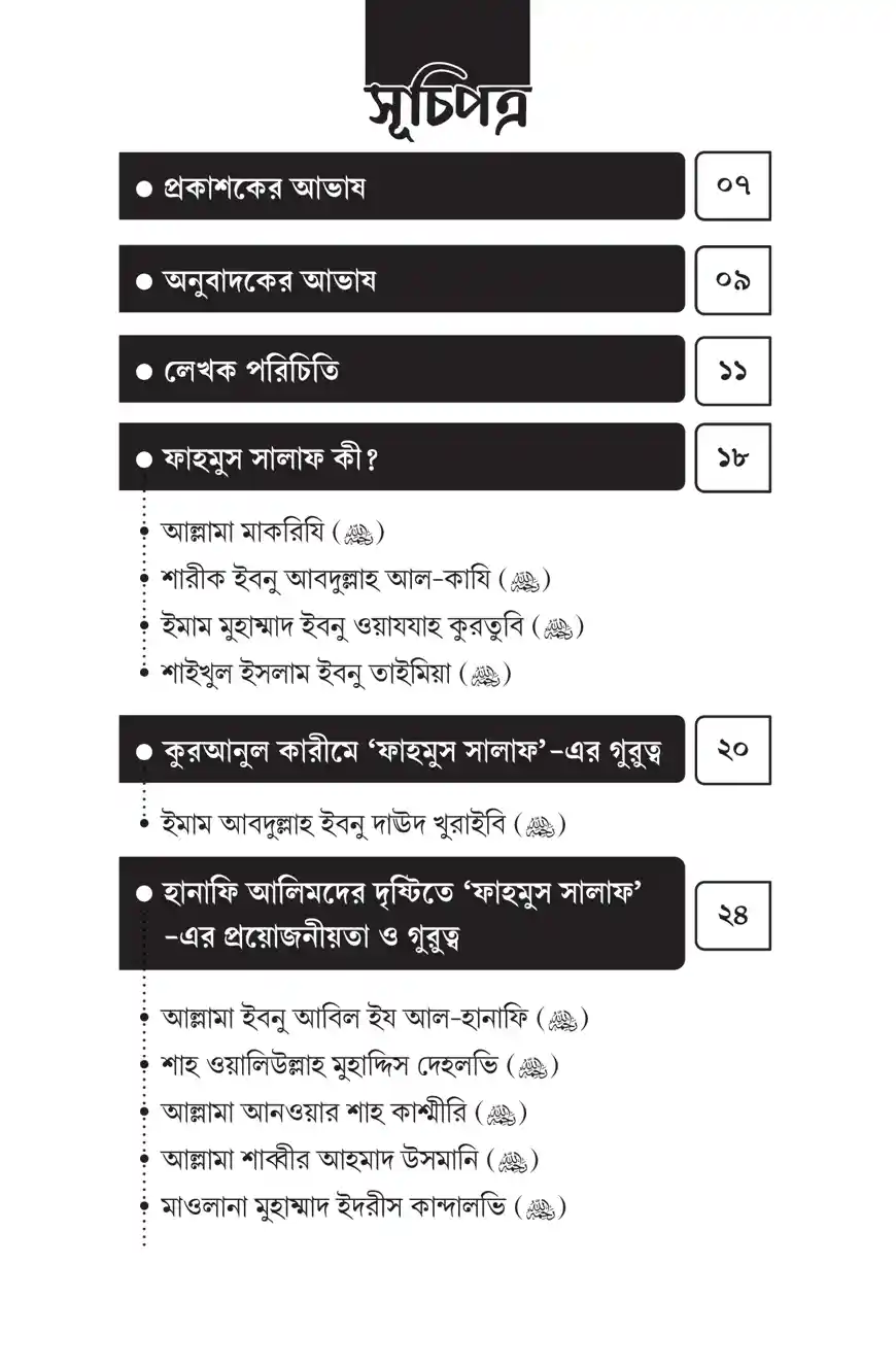 এই ছোট্ট বইটিতে ‘ফাহমুস সালাফ’ সম্পর্কে লেখক- মুহাক্কিক,শাইখ গুলাম মুস্তাফা যহীর আমানপুরি হাফিযাহুল্লাহ তাঁর তাহকীক অনুযায়ী সহীহ বর্ণনার মাধ্যমে ‘ফাহমুস সালাফ’ কী,এর গুরুত্ব ও প্রয়োজনীয়তা,হকপন্থি দল ও তাদের বৈশিষ্ট্য তুলে ধরেছেন। তিনি সালাফ ও খালাফ ইমামগণের প্রমাণিত বক্তব্যের মাধ্যমে দীন বোঝার ও হকের উপর টিকে থাকার মূলনীতি তুলে ধরেছেন।