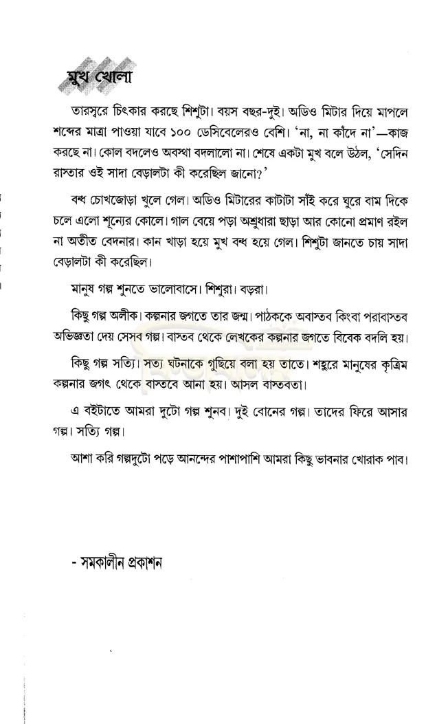 এ বইটাতে আমরা দুটো গল্প শুনব। দুই বোনের গল্প। তাদের ফিরে আসার গল্প। সত্যি গল্প। আশা করি গল্পদুটো পড়ে আনন্দের পাশাপাশি আমরা কিছু ভাবনার খোরাক পাব।