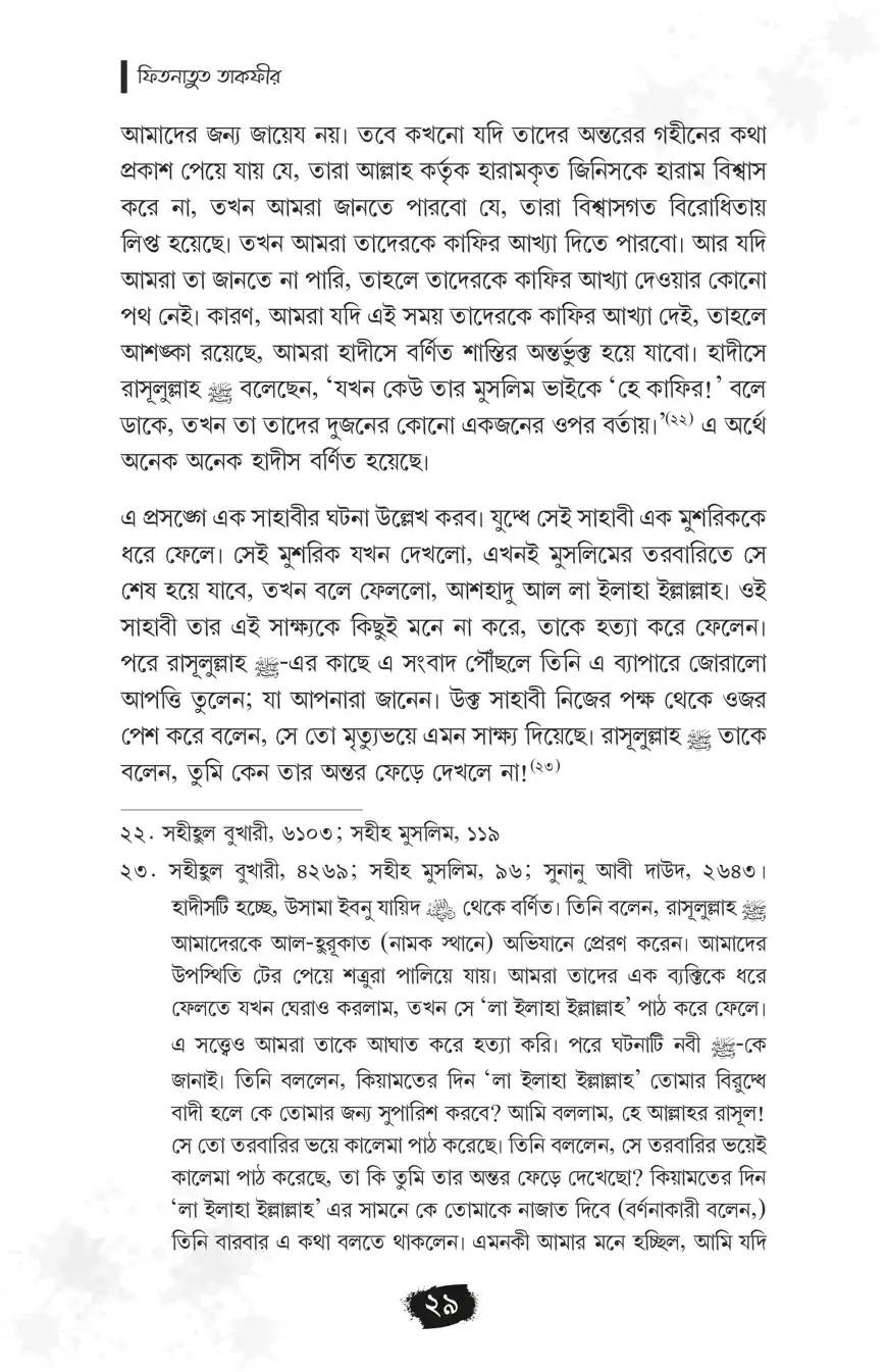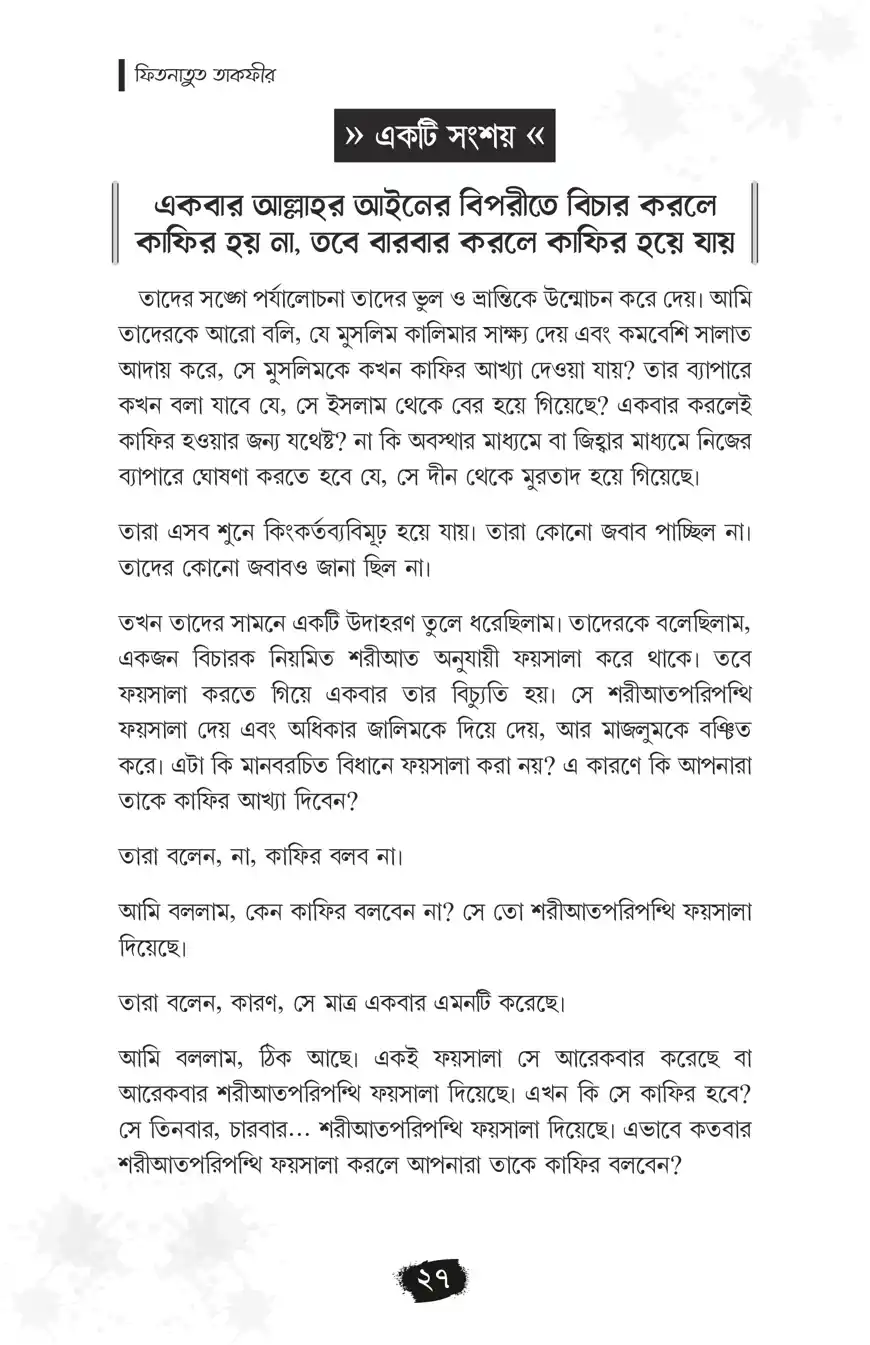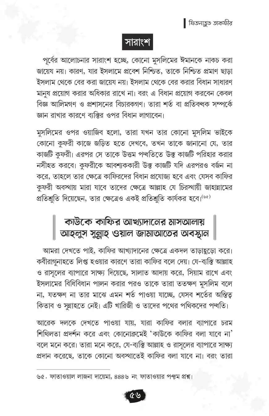 ‘মুসলিমকে কাফির বলা’র ফিতনা একটি প্রাচীন ফিতনা। যা বর্তমান সময়েও খুবই প্রাসঙ্গিক। এখন পর্যন্ত ‘মুসলিম’দেরকে বিশেষ করে ‘মুসলিম শাসক’দেরকে কাফির বলা এক শ্রেণির বিদআতির নিত্যদিনের কর্ম। এক্ষেত্রে ‘আল্লাহর নাযিলকৃত বিধান অনুযায়ী শাসন না করা, সে অনুযায়ী ‘ফয়সালা না দেওয়া’, ইত্যাদি কমন অভিযোগ আরোপ করে ‘তাকফীর’ বা ‘কাফির বলা’ হয়। এই ছোট্ট পুস্তিকাটিতে মুসলিমকে কাফির বলার ফিতনা, আল্লাহর নাযিলকৃত বিধান অনুযায়ী শাসন ও ফয়সালা বিষয়ে গুরুত্বপূর্ণ আলোচনা করা হয়েছে। এ বিষয়ে হকপন্থিদের অবস্থান বলিষ্ঠভাবে তুলে ধরা হয়েছে।