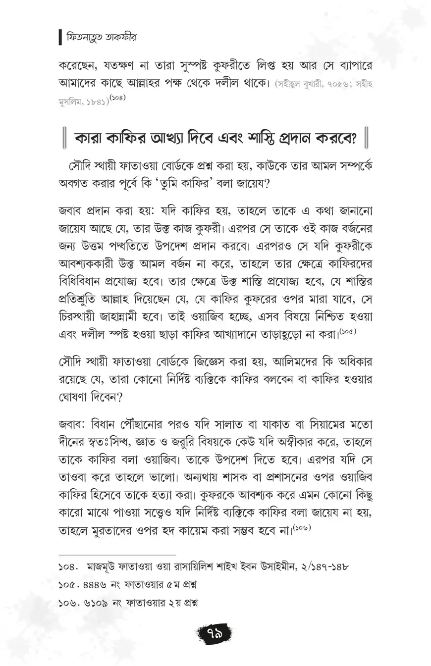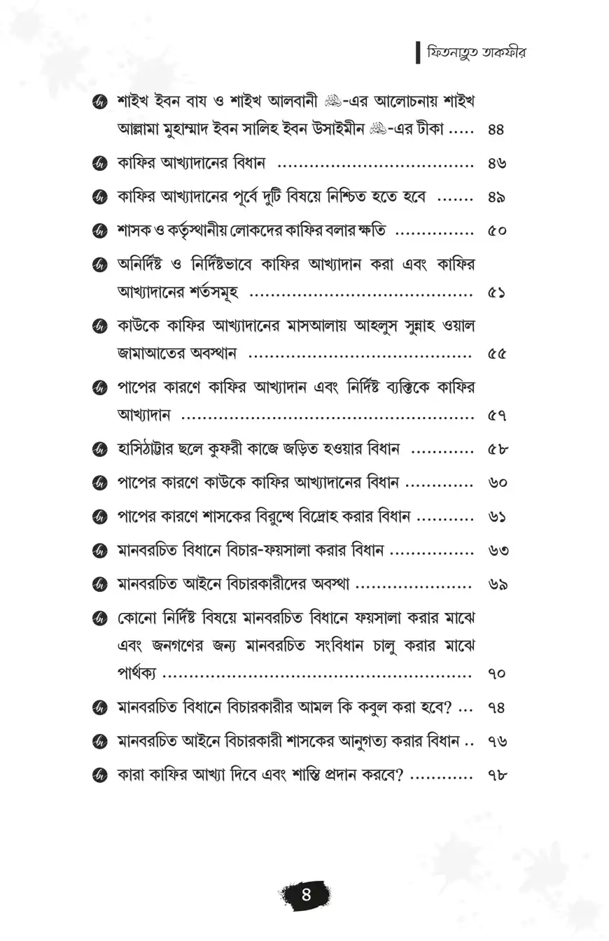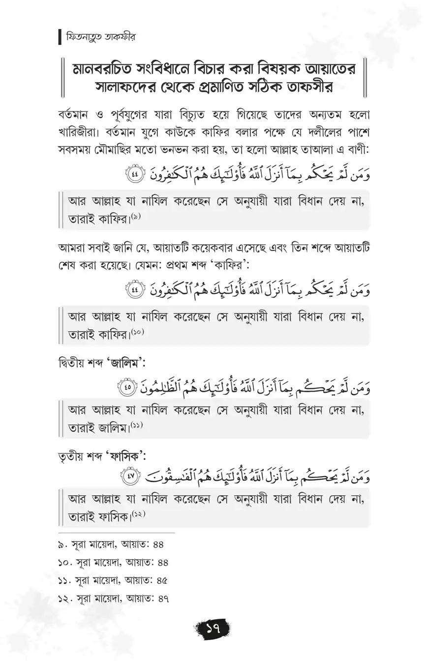 ‘মুসলিমকে কাফির বলা’র ফিতনা একটি প্রাচীন ফিতনা। যা বর্তমান সময়েও খুবই প্রাসঙ্গিক। এখন পর্যন্ত ‘মুসলিম’দেরকে বিশেষ করে ‘মুসলিম শাসক’দেরকে কাফির বলা এক শ্রেণির বিদআতির নিত্যদিনের কর্ম। এক্ষেত্রে ‘আল্লাহর নাযিলকৃত বিধান অনুযায়ী শাসন না করা, সে অনুযায়ী ‘ফয়সালা না দেওয়া’, ইত্যাদি কমন অভিযোগ আরোপ করে ‘তাকফীর’ বা ‘কাফির বলা’ হয়। এই ছোট্ট পুস্তিকাটিতে মুসলিমকে কাফির বলার ফিতনা, আল্লাহর নাযিলকৃত বিধান অনুযায়ী শাসন ও ফয়সালা বিষয়ে গুরুত্বপূর্ণ আলোচনা করা হয়েছে। এ বিষয়ে হকপন্থিদের অবস্থান বলিষ্ঠভাবে তুলে ধরা হয়েছে।