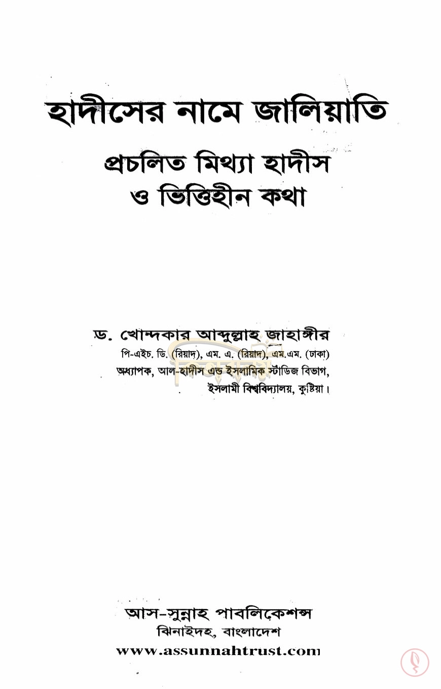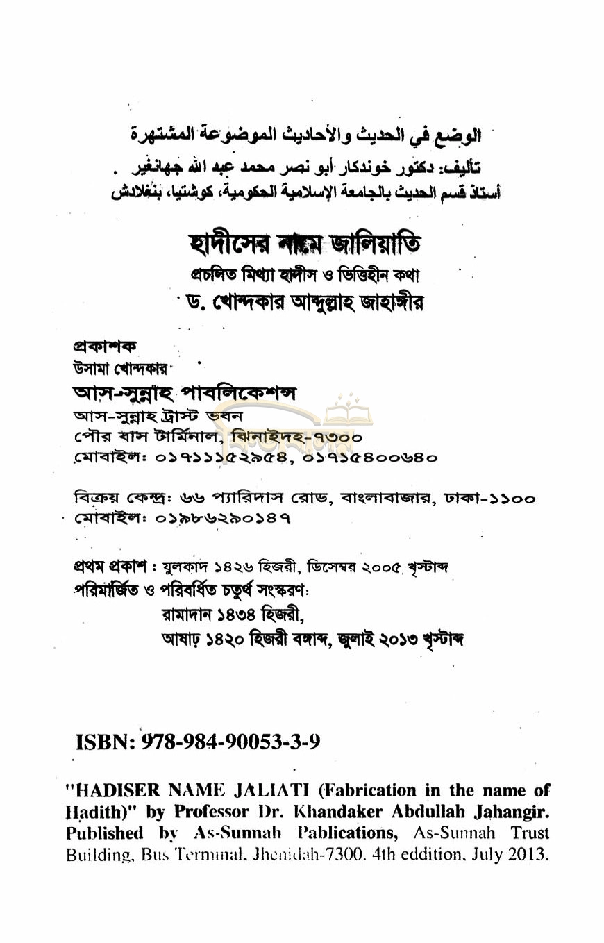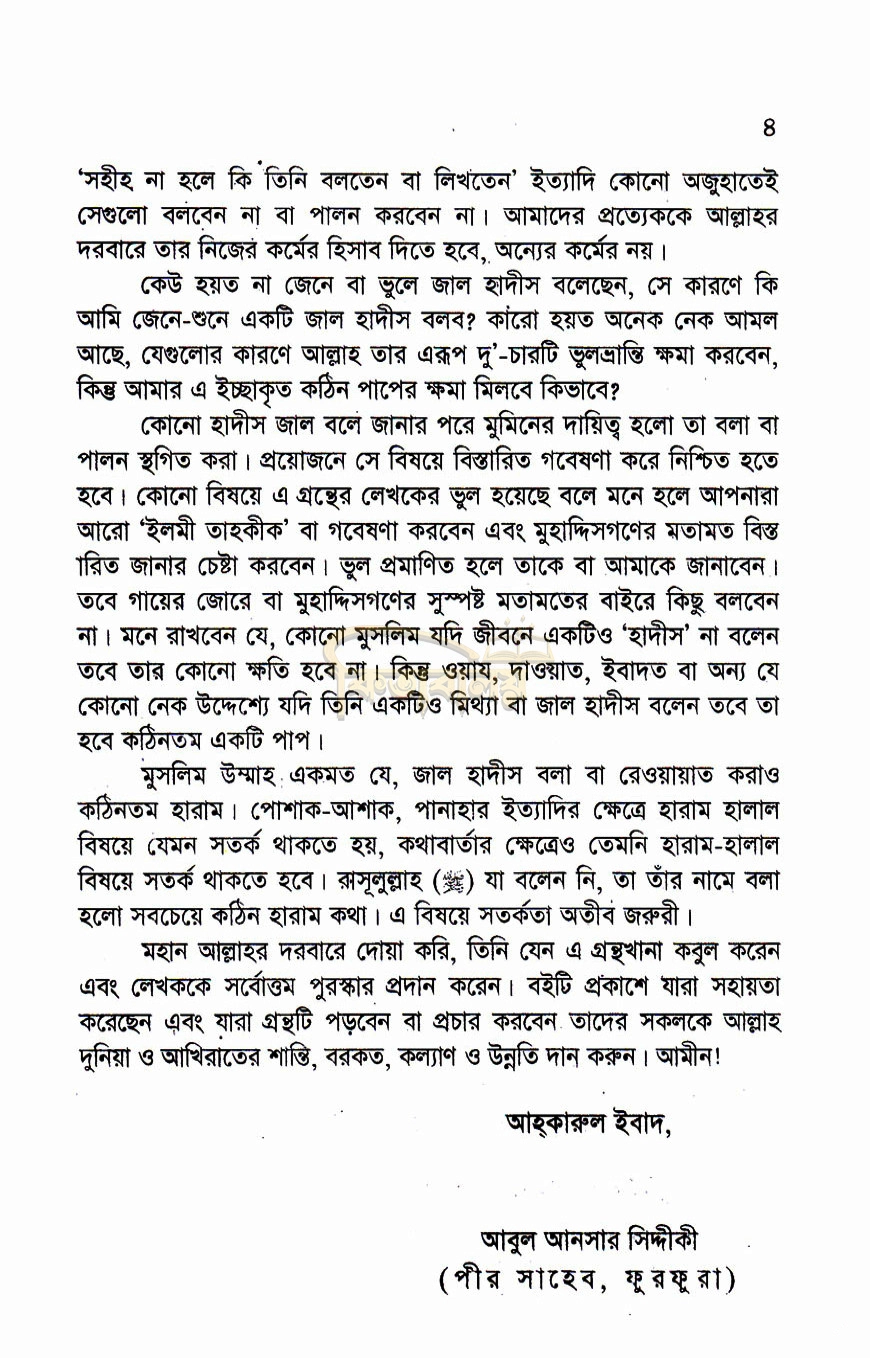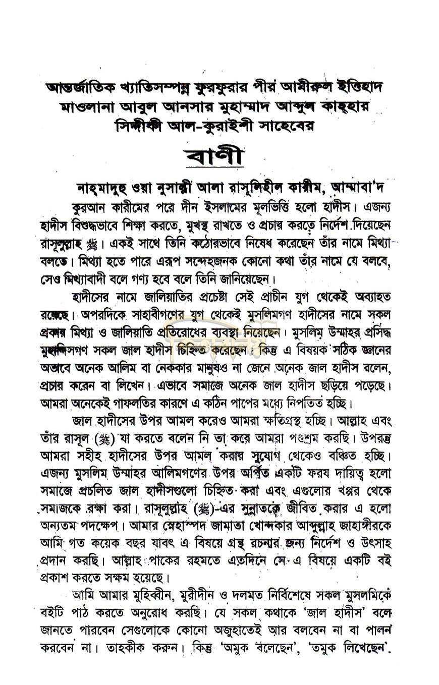 দ্বিতীয়ত: শুধু জাল হাদীস চিহ্নিত করাই আমাদের উদ্দেশ্য নয়। আমাদের উদ্দেশ্য হলো বিশ্বাসে ও কর্মে জাল হাদীস বর্জন করে সহীহ হাদীসের উপর আমল করে নিজেদের নাজাতের জন্য চেষ্টা করা। এজন্য জাল হাদীস উল্লেখের সময় সে বিষয়ক সহীহ হাদীসগুলো সম্পর্কে সংক্ষেপে হলেও কিছু বলেছি।