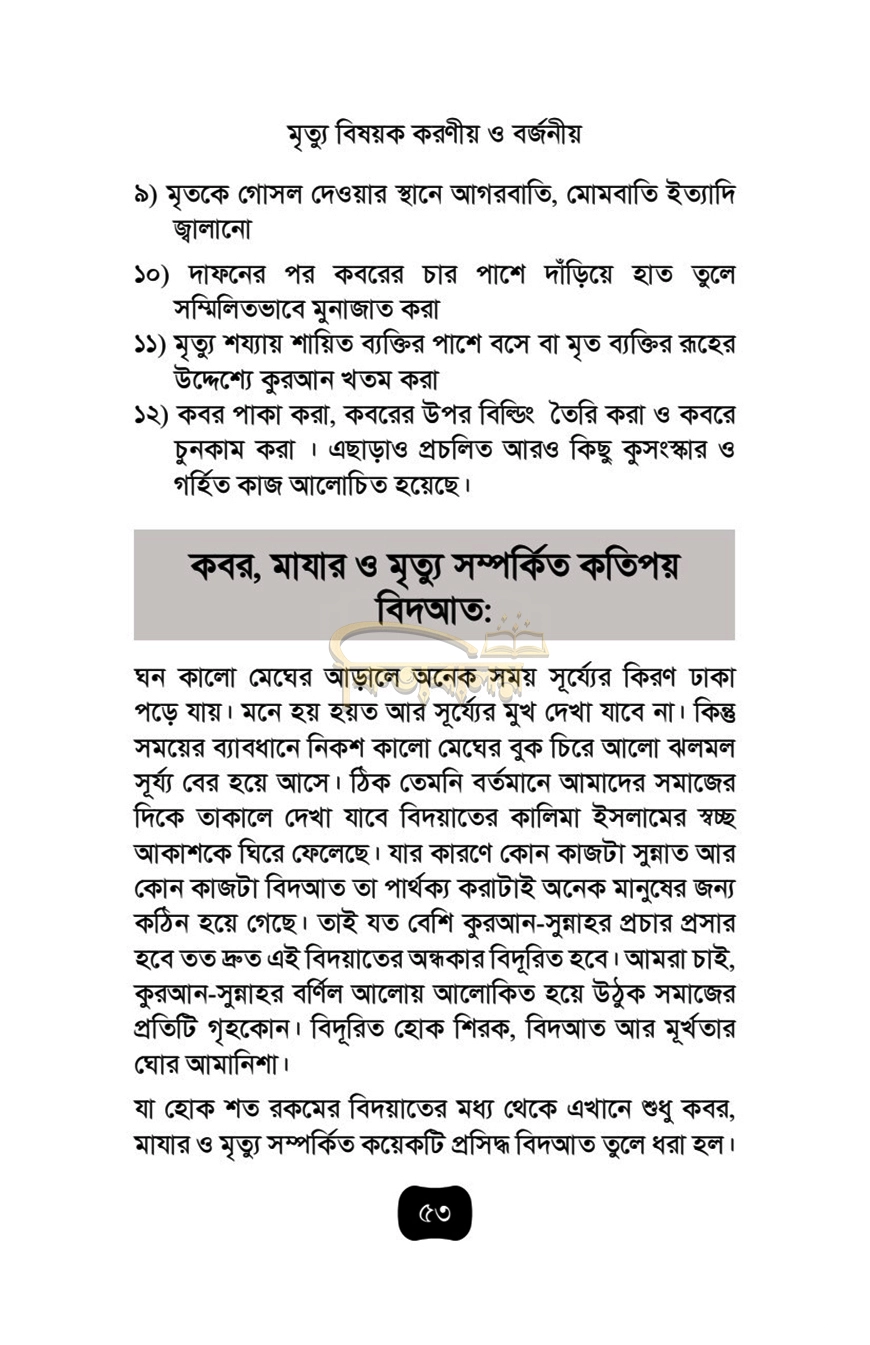 ২- মৃত্যুকে কেন্দ্র করে ব্যাপক বিদআতী কর্মযজ্ঞ, যার প্রতিটা রন্ধ্রে রন্ধ্রে বিদআত ঢুকে রয়েছে। মৃত্যুর পর থেকে গোসল, কাফন, জানাযা, দাফন এবং তার পরবর্তীকালে যা কিছু করা হয় তা যদি আমরা কুরআন সুন্নাহর চোখ দিয়ে তাকাই তাহলে খুব সহজেই দেখতে পাব যে, সুন্নাহ অনুযায়ী এই কাজগুলো কোনো মৃত ব্যক্তির পাওয়া যেন এখন প্রায় অসম্ভব হয়ে দাঁড়িয়েছে, মহান আল্লাহর রহমতে প্রিয় শাইখ আব্দুল্লাহিল হাদী বিন আব্দুল জলীল মাদানী (হাফি.) এই দরকারী বিষয়েই কলম ধরেছেন, শুধু যে এই ব্যাপারে প্রচলিত ভুলভ্রান্তি তুলে ধরেছেন তাই নয় বরং প্রতিটা ক্ষেত্রে সুন্নাহ অনুযায়ী আমাদের করনীয় কি হবে সেটাও সুনিপুণভাবে তুলে ধরেছেন আলহামদুলিল্লাহ এবং অবশেষে এ বিষয়ক অসংখ্য প্রশ্নের উত্তর বইয়ের শেষ অংশে সংযোজন করেছেন যাতে করে পাঠকগণ খুব সহজেই বিষয়বস্তু আত্মস্থ করতে পারেন, আল্লাহ তা'আলা শাইখকে উত্তম জাযা দান করুন, আশা করি এর মাধ্যমে সমাজ থেকে মৃত্যু ও কবর বিষয়ক বিদআত, কুসংস্কার দূর হবে, সুন্নাতের আলোয় আলোকিত হবে আমাদের চারপাশ।