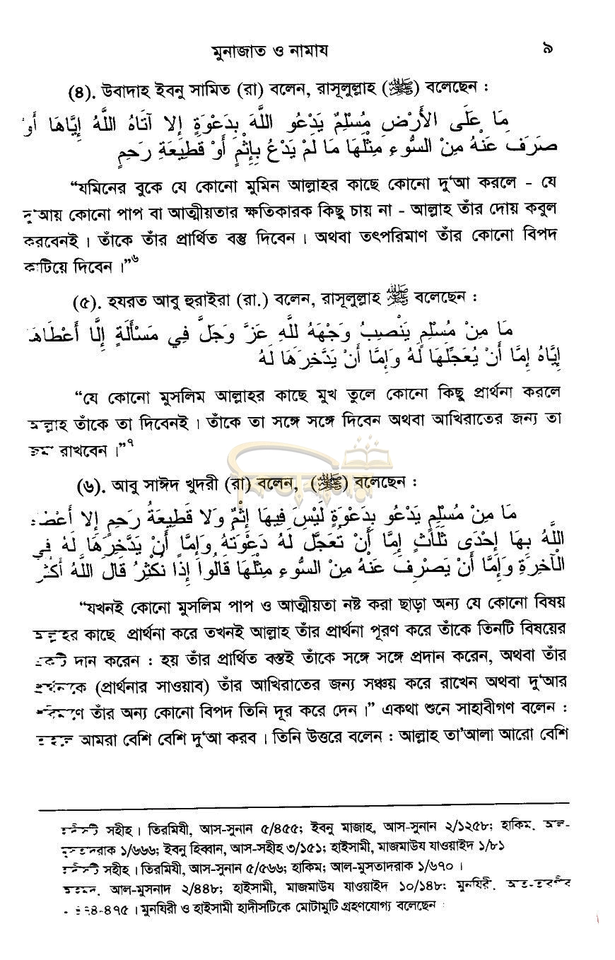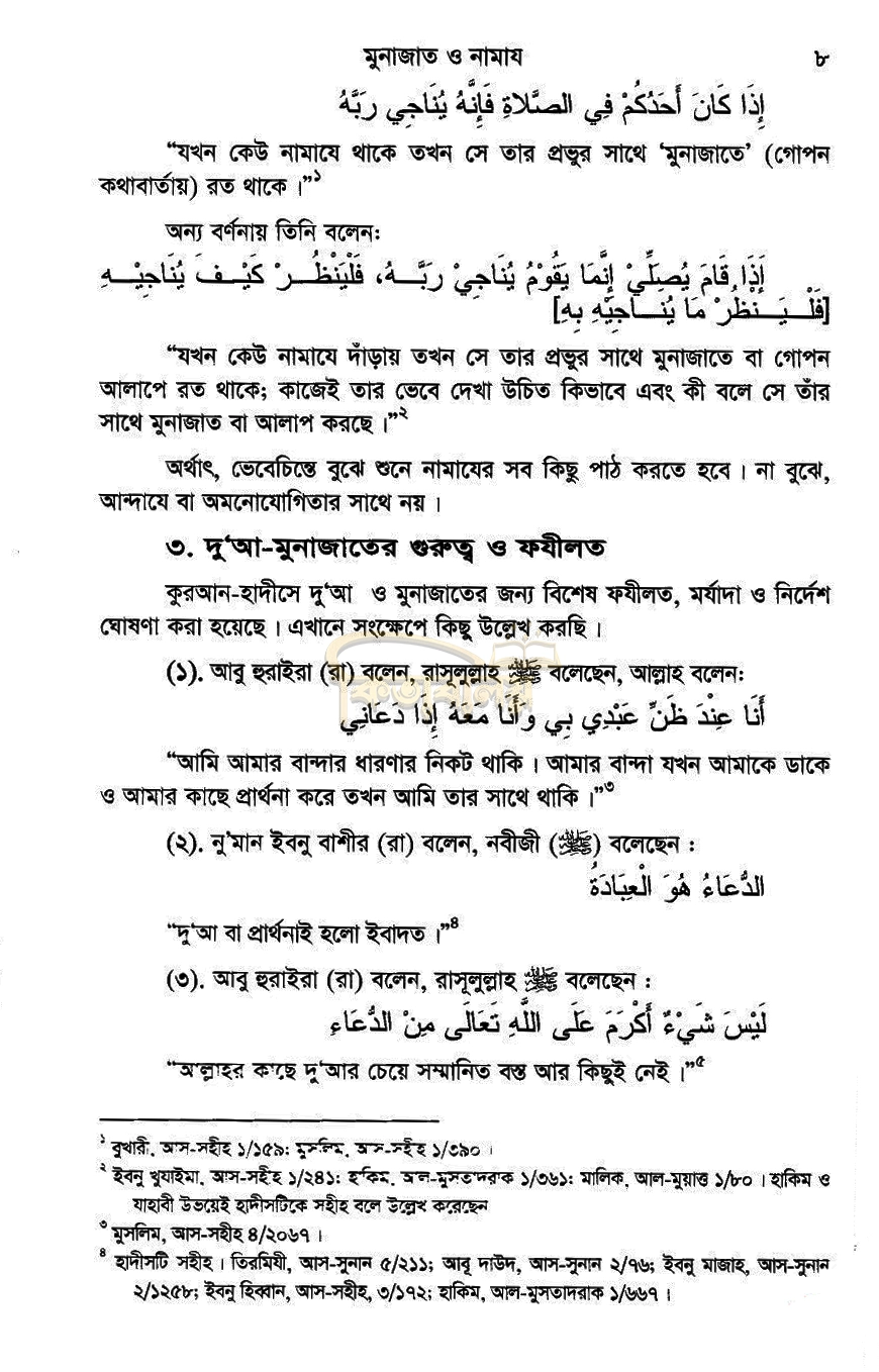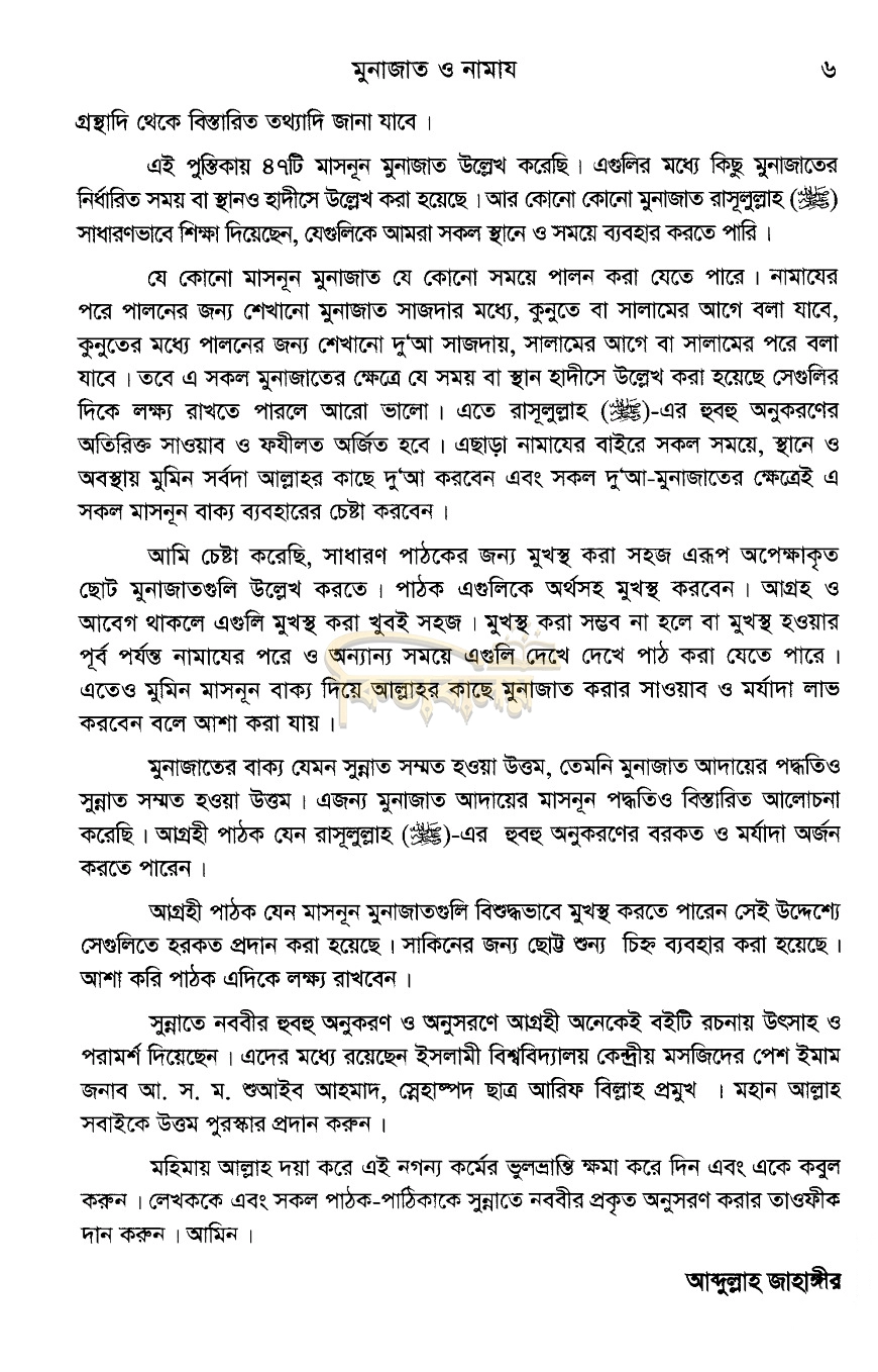 মুনাজাতের গুরুত্ব আমরা কমবেশি জানি। তবে এক্ষেত্রে রাসুলুল্লাহ (ছা:)-এর আচরিত ও শেখানো মোনাজাত গুলি সম্পর্কে আমাদের দেশের অধিকাংশ দ্বীনদার মুসলিম অবগত নন। শুধু তাই নয়, অধিকাংশ ধার্মিক মুসলিম ও আলিম এ বিষয়ে আগ্রহীও নন। বিষয়টি দুঃখজনক। রাসুলুল্লাহ (ছা:) কর্তৃক শেখানো মোনাজাত গুলি পালনের মধ্যে রয়েছে অসাধারণ সওয়াব, মর্যাদা, বরকত ও কবুলিয়াত। এ ব্যাপারে সকলেরই আগ্রহী হওয়া দরকার। এই পুস্তিকাটিতে নামাজের মধ্যে ও নামাজের পরে পালনীয় প্রায় অর্ধশত মাসনুন মোনাজাত সহিহ হাদিসের আলোকে সংকলন করা হয়েছে। সকল মুহিব্বিন, মুবাল্লিগীনএবং সর্বস্তরের সকল আলিম ও দ্বীনদার মুসলিম বইটি পাঠ করবেন এবং এ সকল মাসনুন মোনাজাত অর্থসহ মুখস্ত করে মাসনুন আদব ও পদ্ধতিতে আদায় করবেন।