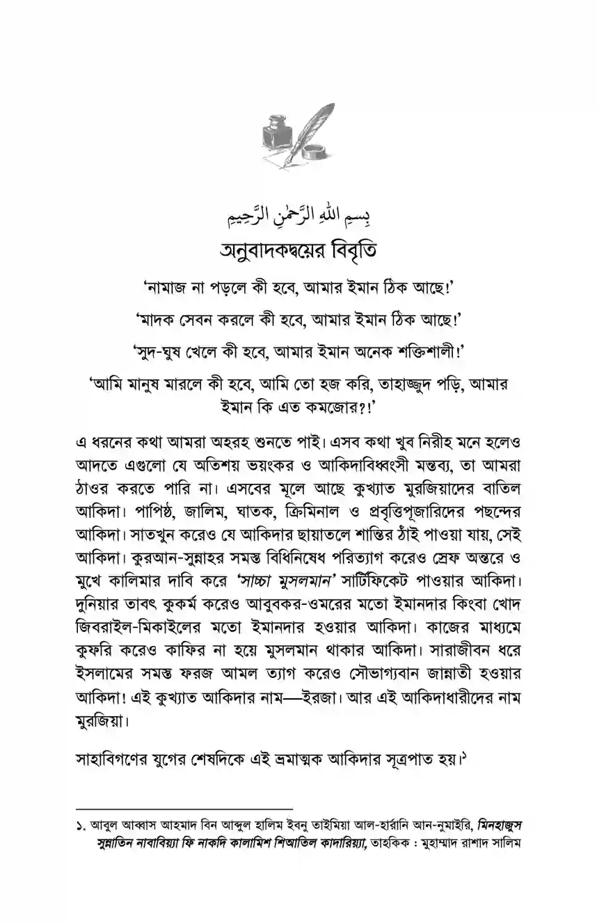 এ ধরনের কথা আমরা অহরহ শুনতে পাই। এসব কথা খুব নিরীহ মনে হলেও আদতে এগুলো যে অতিশয় ভয়ংকর ও আকিদাবিধ্বংসী মন্তব্য, তা আমরা ঠাওর করতে পারি না। এসবের মূলে আছে কুখ্যাত মুরজিয়াদের বাতিল আকিদা। পাপিষ্ঠ, জালিম, ঘাতক, ক্রিমিনাল ও প্রবৃত্তিপূজারিদের পছন্দের আকিদা। সাতখুন করেও যে আকিদার ছায়াতলে শান্তির ঠাঁই পাওয়া যায়, সেই আকিদা। কুরআন-সুন্নাহর সমস্ত বিধিনিষেধ পরিত্যাগ করেও স্রেফ অন্তরে ও মুখে কালিমার দাবি করে 'সাচ্চা মুসলমান' সার্টিফিকেট পাওয়ার আকিদা। দুনিয়ার তাবৎ কুকর্ম করেও আবুবকর-ওমরের মতো ইমানদার কিংবা খোদ জিবরাইল-মিকাইলের মতো ইমানদার হওয়ার আকিদা। কাজের মাধ্যমে কুফরি করেও কাফির না হয়ে মুসলমান থাকার আকিদা। সারাজীবন ধরে ইসলামের সমস্ত ফরজ আমল ত্যাগ করেও সৌভাগ্যবান জান্নাতী হওয়ার আকিদা! এই কুখ্যাত আকিদার নাম-ইরজা। আর এই আকিদাধারীদের নাম মুরজিয়া