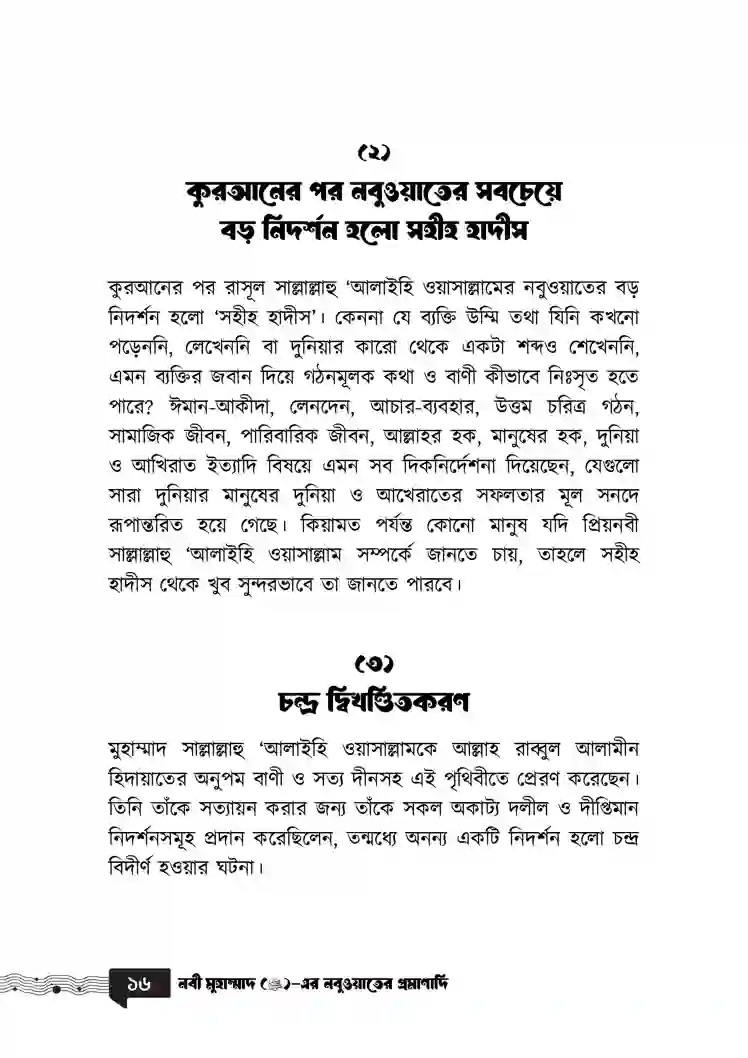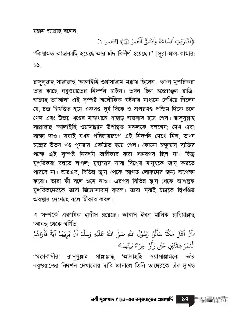 মক্কাবাসীরা রাসূলুল্লাহ সাল্লাল্লাহু ‘আলাইহি ওয়াসাল্লামকে তাঁর নবুওয়াতের নিদর্শন দেখানোর দাবি জানালে তিনি তাদেরকে” চাঁদ দু’খণ্ড নবী মুহাম্মাদ (ক)-এর নবুওয়াতের প্রমাণাদি