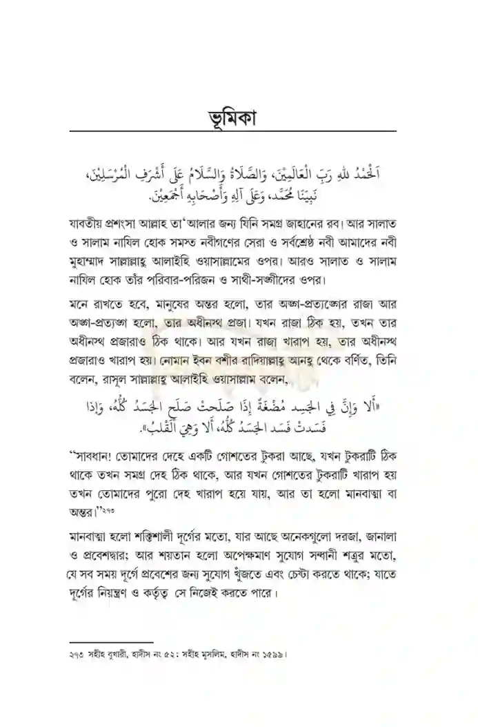 “সাবধান! শরীরে একটি চিবানো গোস্তের টুকুরা রয়েছে। যদি সেটি বিশুদ্ধ হয়ে যায় তবে সারা শরীরই বিশুদ্ধ হয়ে যায়, আর যখন তা বিনষ্ট হয়ে যায় সারা শরীর বিনষ্ট হয়ে যায়, সাবধান, তা হচ্ছে কালব বা অন্তর।”