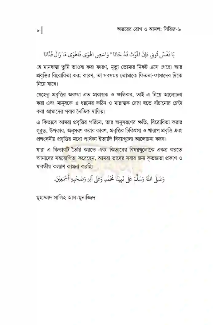 অত্যন্ত আনন্দের বিষয় যে, এ বিষয়গুলো নিয়ে শাইখ মুহাম্মাদ সালেহ আল-মুনাজ্জিদ “মুফসিদাতুল কুলূব” ও “আমালুল কুলূব” নামক সিরিজ লিখেছেন। তারই বাংলা অনুদিতরুপ ❝অন্তরের রোগ ও আমল❞ এই সিরিজ।