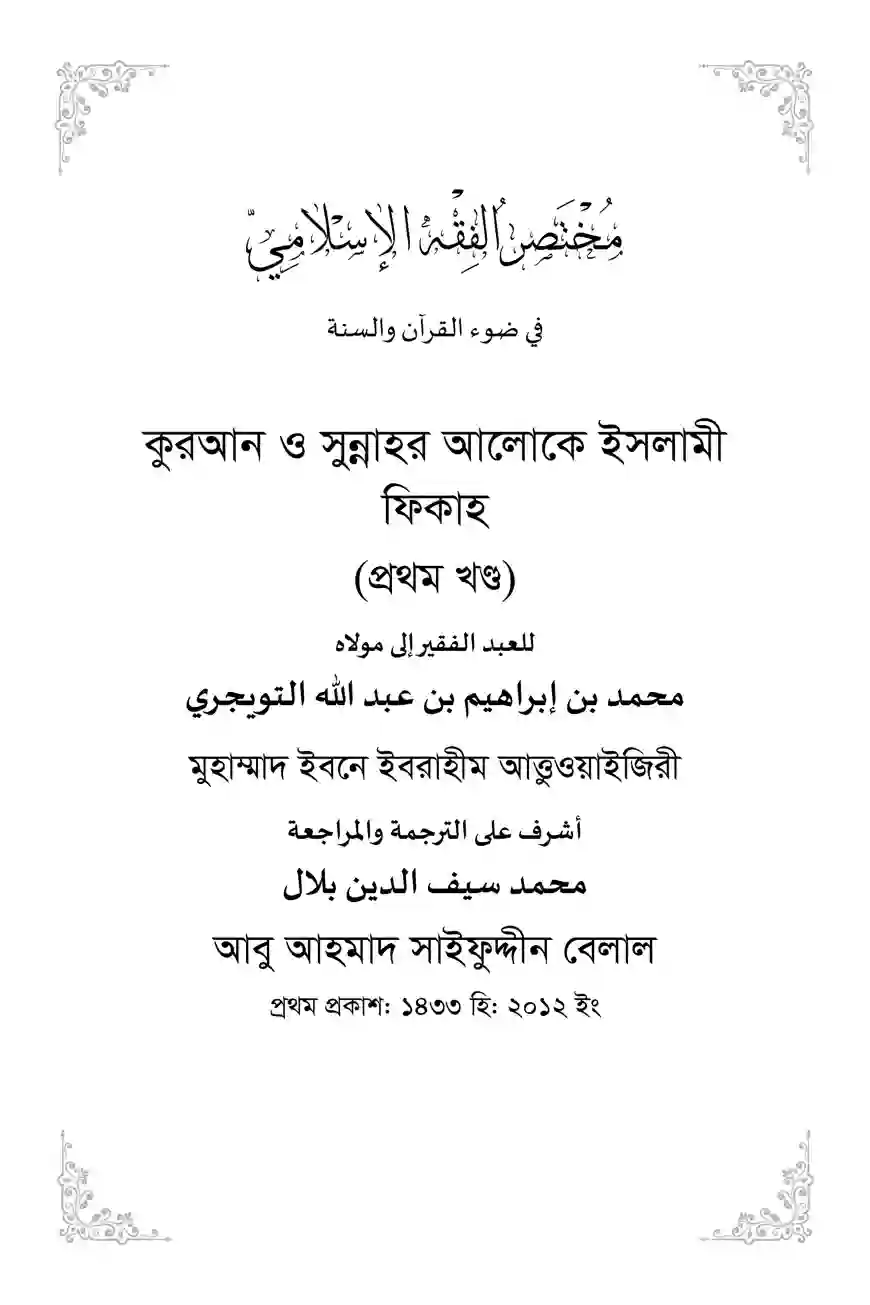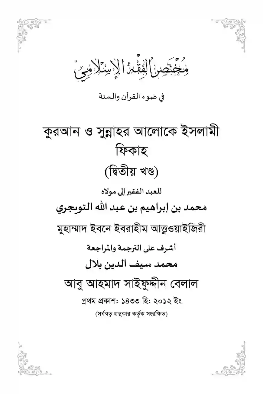 শাইখ মুহাম্মদ বিন ইবরাহীম আত তুআইজিরী (হাফি.) এর কুরআন ও সুন্নাহর আলোকে ইসলামী ফিকাহ, প্রায় ২০০০ পৃষ্ঠার এমন একটা কিতাব যেখানে তাওহিদ থেকে শুরু করে আদব আখলাক, দু‘আ যিকির, লেনদেন, ইবাদত, আল্লাহর পথে আহ্বান প্রায় সব বিষয়কে শামিল করা হয়েছে বিষয়ভিত্তিক আকারে। আমাদেরকে অনেকেই জিজ্ঞেস করে ইসলামের সব বিষয় একই গ্রন্থে পাওয়া যায় বিষয়ভিত্তিক আকারে এমন কোন বই আছে কিনা, সত্যি বলতে ইসলাম তো বিশাল আর ব্যাপক, সবটা একত্রে একই গ্রন্থে পাওয়া অসম্ভব তবে এটাতে যা কিছু রয়েছে তা প্রাথমিকভাবে একজন মুসলিমের জন্য যথেষ্ট হয়ে যাবে ইন শা আল্লাহ। কেউ এই একটা বই পড়াতেই ইসলামের প্রায় সকল বিষয়ের বেসিক জ্ঞান পেয়ে যাবে ইন শা আল্লাহ।