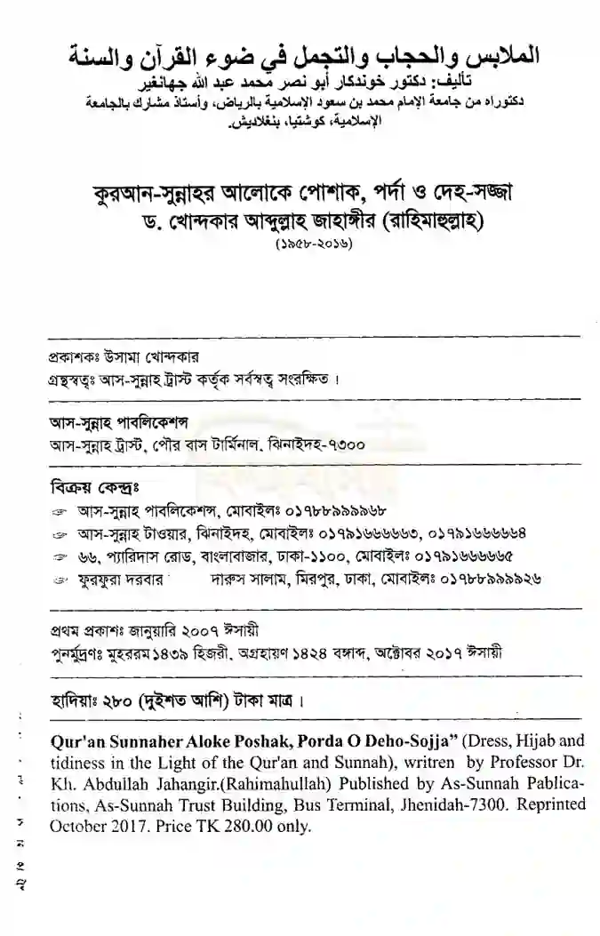 এমতাবস্থায় আমাদের সকলের দায়িত্ব এ ব্যাপারে ইসলামের সঠিক অবস্থান নিশ্চিত হওয়া। এর যৌক্তিকতা বোঝা এবং পালন করা। এ ক্ষেত্রে ইসলামে সঠিক পোশাক পর্দা ও দেহ-সজ্জার পূর্ণ বিবরণ জানতে বক্ষ্যমাণ গ্রন্থটি বেশ ফলপ্রসূ হবে আমাদের বিশ্বাস।