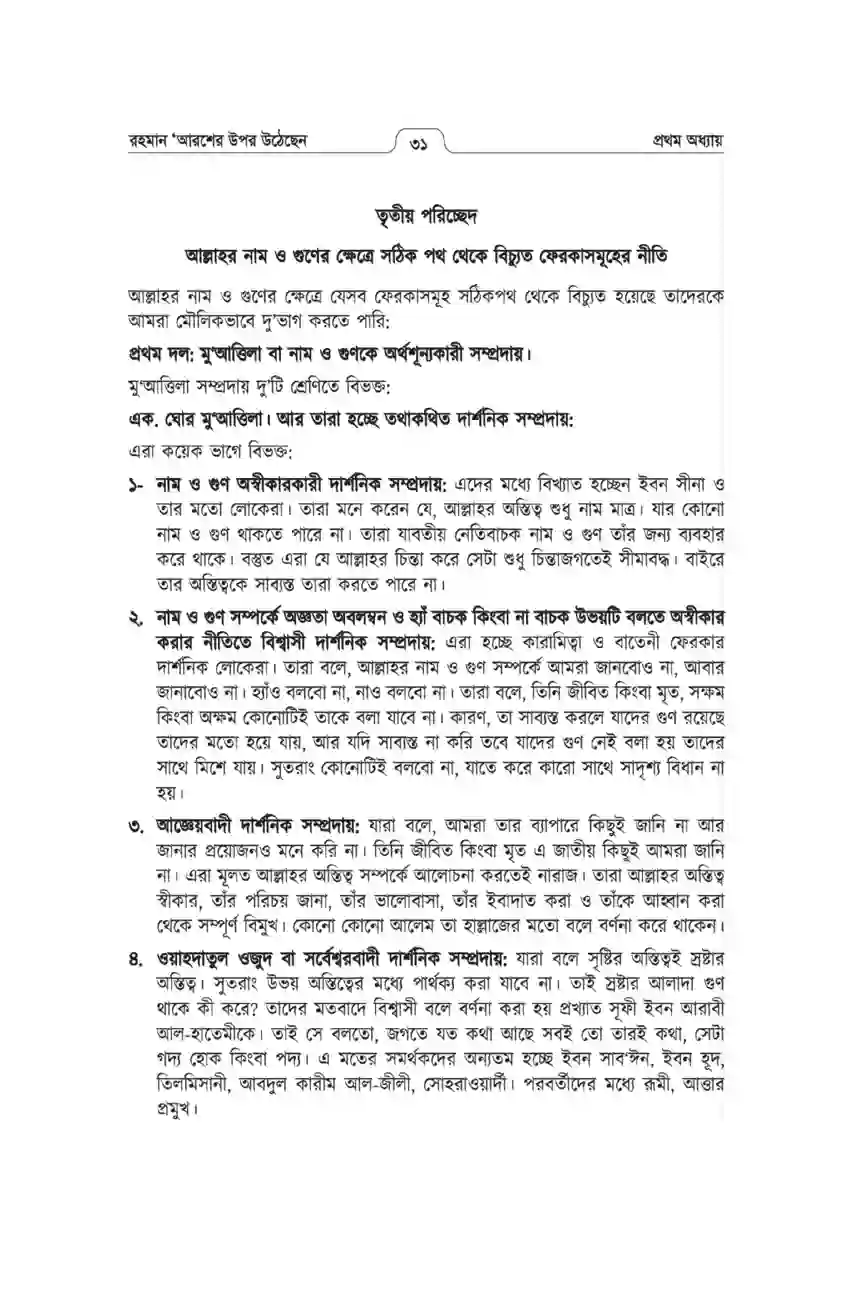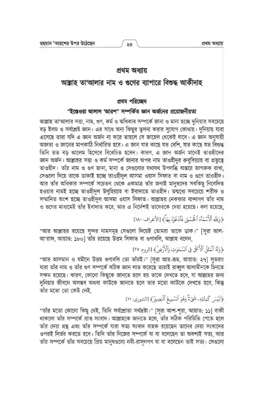 কোনো সন্দেহ নেই যে, সবচেয়ে বড় ও মর্যাদাপূর্ণ জ্ঞান হচ্ছে আকীদাহ বিষয়ক জ্ঞান। আর আকীদাহ বিষয়ক জ্ঞান বলতে সে জ্ঞানকে বুঝায়, যা আল্লাহ তা‘আলার সাথে সম্পৃক্ত। আল্লাহ তা‘আলা সংক্রান্ত জ্ঞানই হচ্ছে তাওহীদের জ্ঞান। তাওহীদ মানেই হচ্ছে, আল্লাহর সত্তা, নাম, গুণ, কর্ম ও অধিকার সম্পর্কে সম্যক জ্ঞান লাভ। তন্মধ্যে প্রথমেই আসে আল্লাহ তা‘আলার সত্তা, নাম ও গুণ সম্পর্কে জানা। ‘আল্লাহর ‘আরশের উপর উঠা’ এ আকীদাহটি এ তিনটি অংশের সাথেই ওৎপ্রোতভাবে জড়িত। আল্লাহর সত্তা, নাম ও গুণ সম্পর্কে জ্ঞান থাকলেই আকীদাহ’র বাকী বিষয়গুলো জানা সহজ হয়, নতুবা অন্ধকারে হাতড়ে বেড়ানোর মতো অবস্থা হয়।