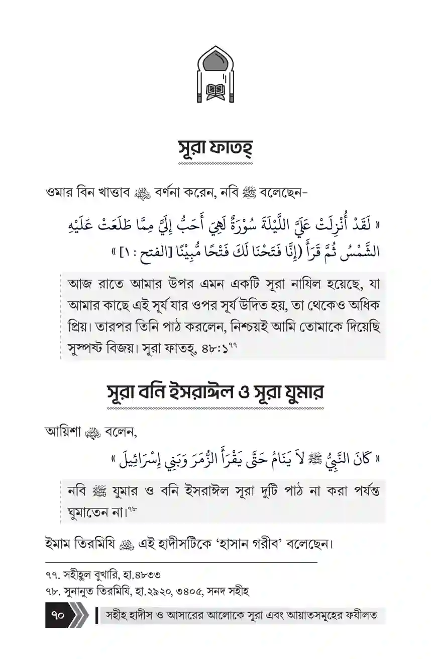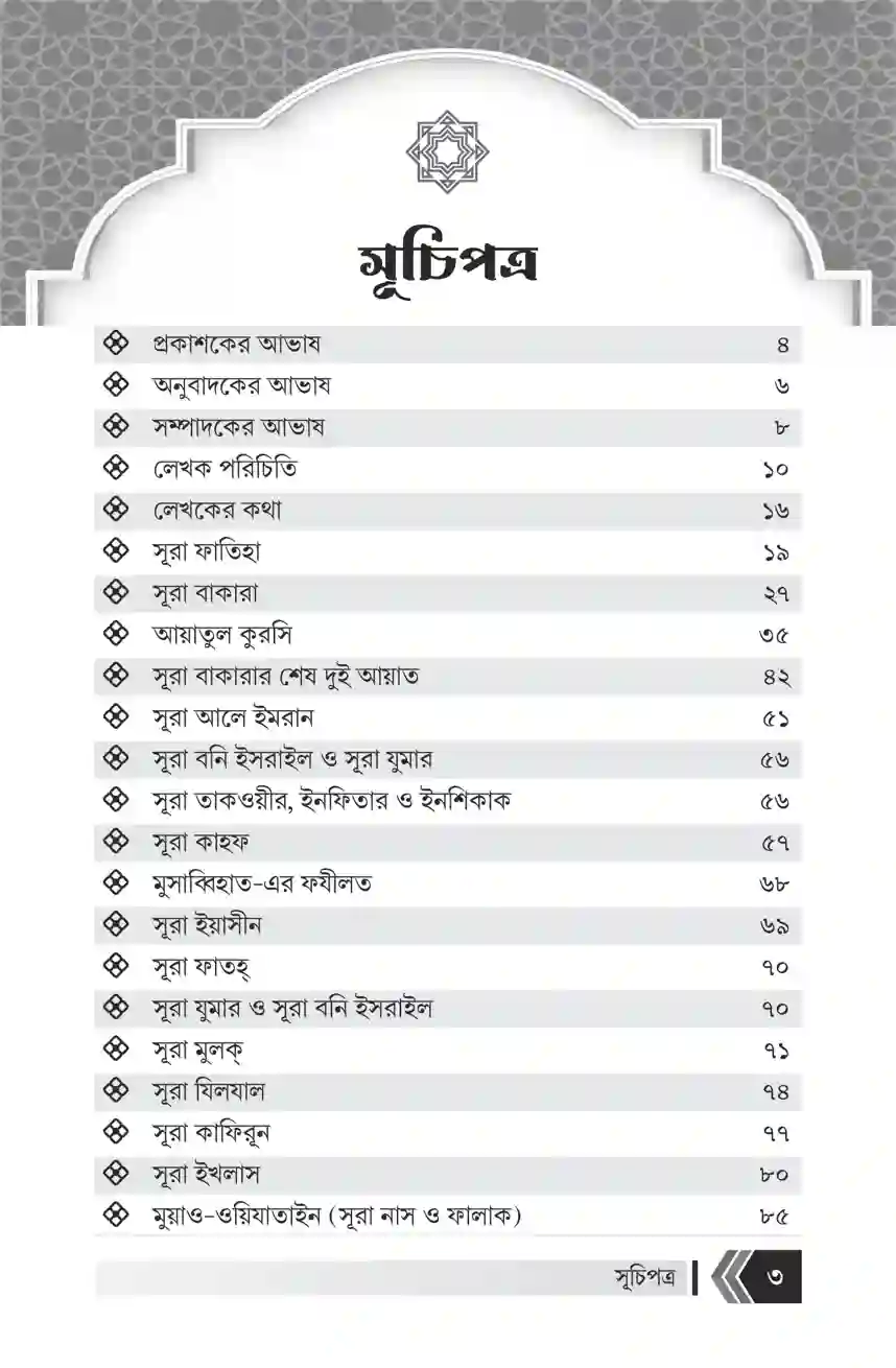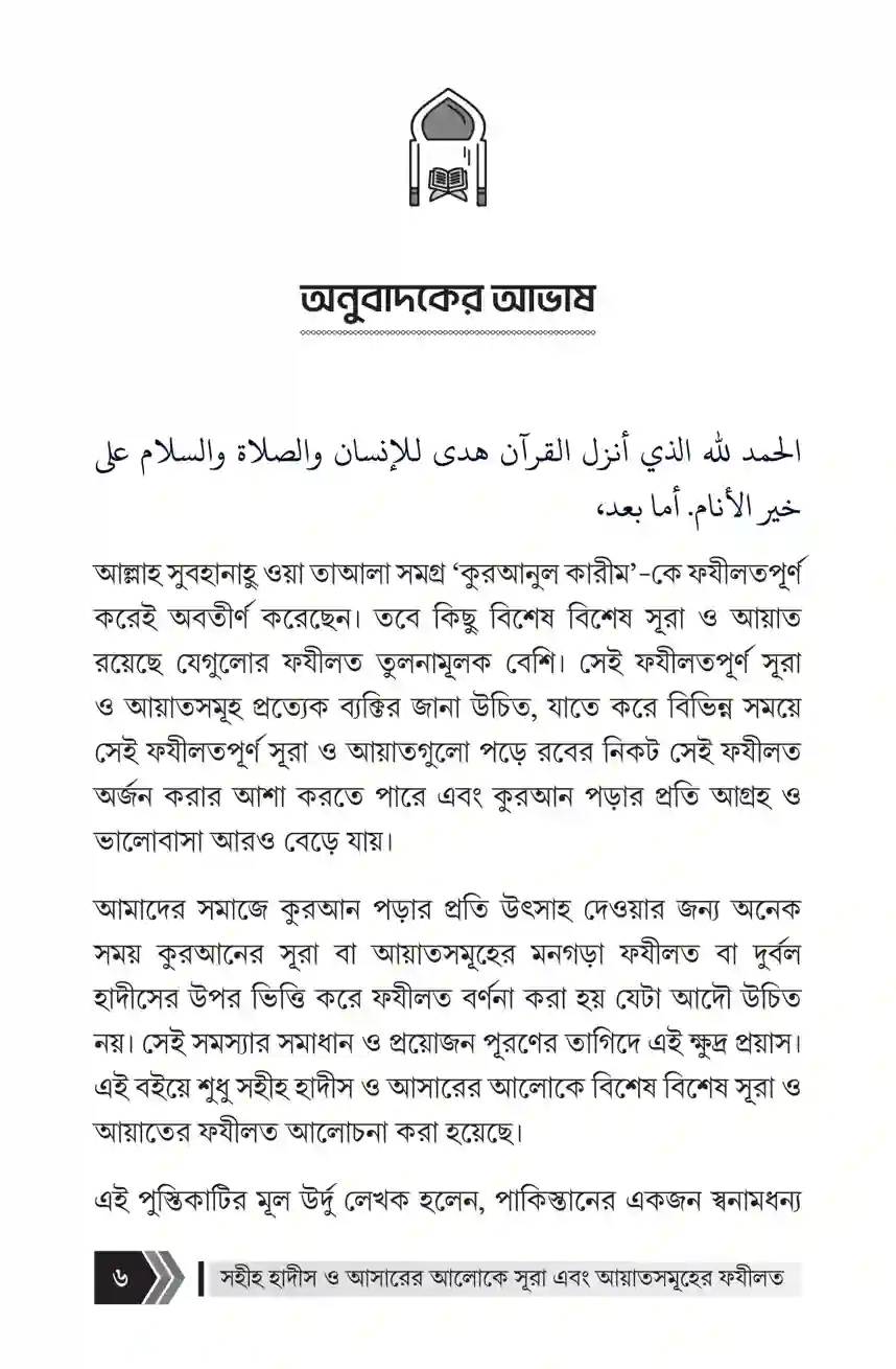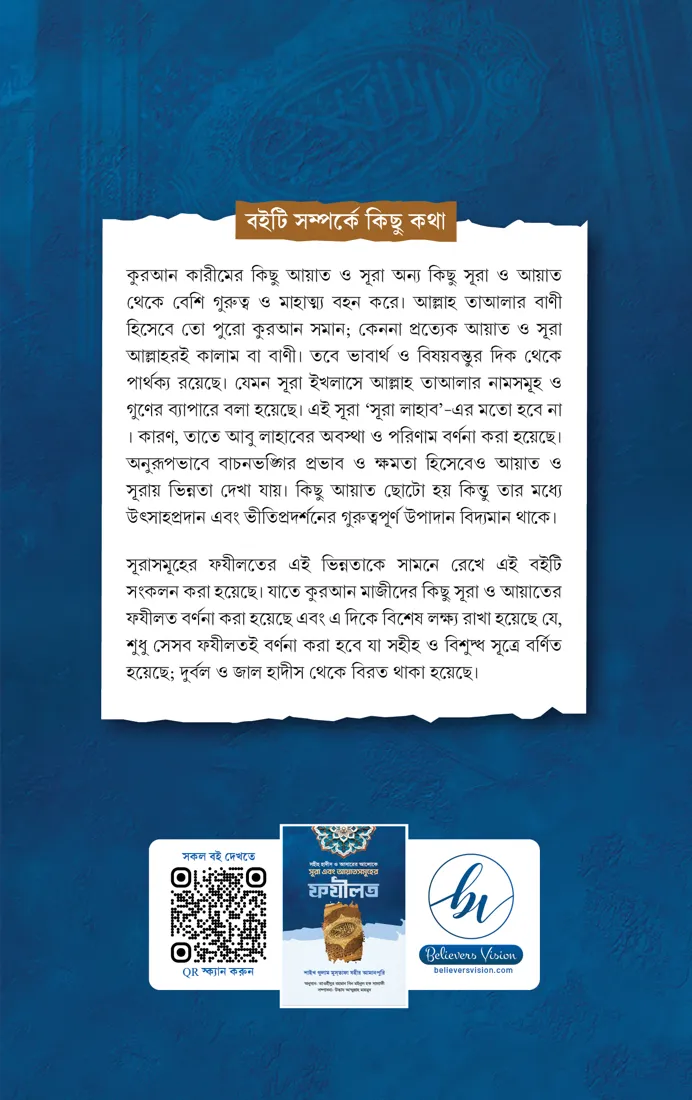 ‘ফযীলতপূর্ণ আমল’ আর ‘আমলের ফযীলত’-এর মধ্যে পার্থক্য না করে আমাদের বুলি শেখানো হয়েছে ‘ফযীলতের ক্ষেত্রে দয়ীফ হাদীস চলে’। অথচ এটা মুহাদ্দিসদের উসূলের অপপ্রয়োগ ছাড়া আর কিছু না।মুসলিম মাত্রই কুরআন তিলাওয়াতকারী। স্বাভাবিকভাবে কুরআন তিলাওয়াতে যেমন অক্ষরে অক্ষরে ১০টি নেকি রয়েছে তেমনি বিশেষ বিশেষ সূরা ও আয়াতসমূহের রয়েছে বিশেষ উপকারিতা ও সওয়াব। আলহামদুলিল্লাহ।আমরা যেন কুরআন মাজীদের বিভিন্ন সূরা ও বিশেষ আয়াতসমূহের সহীহ ফযীলত জেনে নিশ্চিন্তে আমল করতে পারি, সেই নেক নিয়তে আমাদের এই ছোট্ট বইটির প্রকাশ।