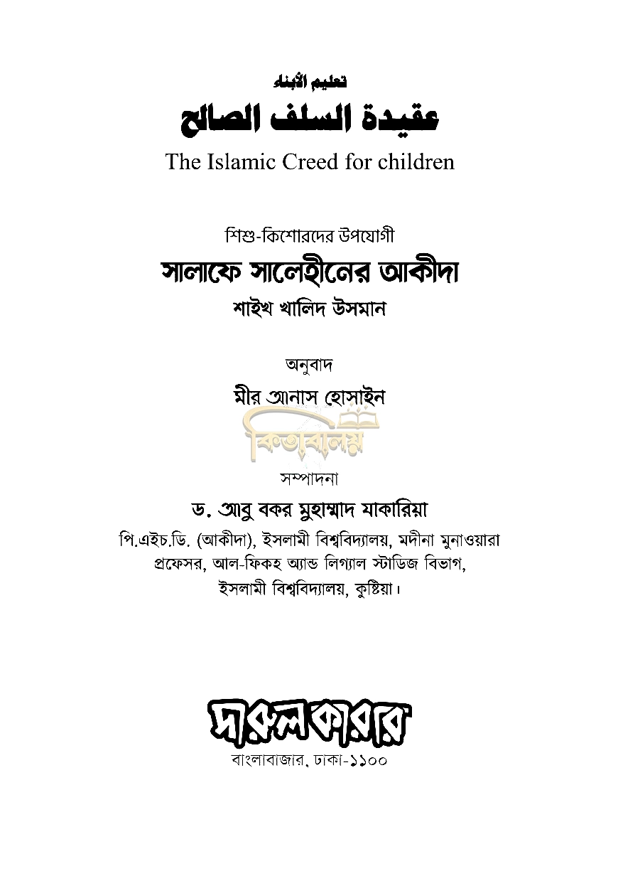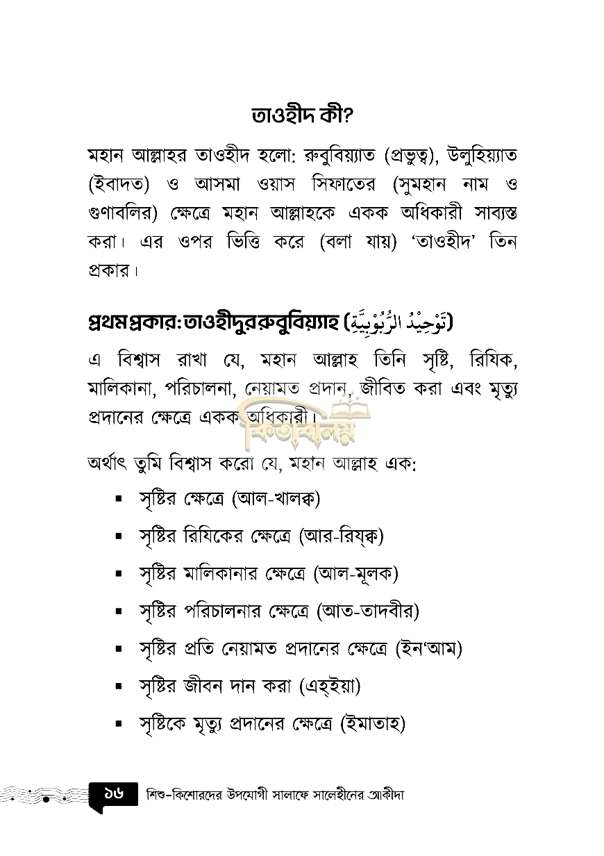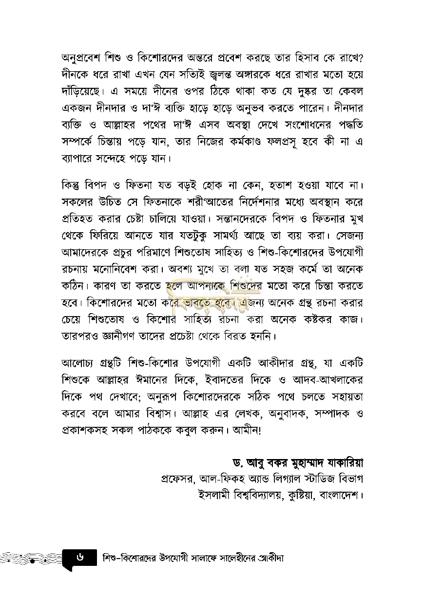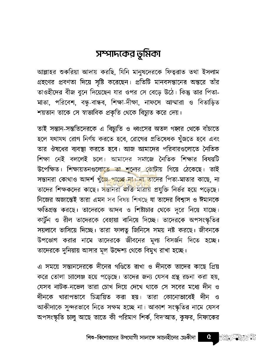 মহান আল্লাহ প্রতিটি মানবসন্তানের অন্তরে তাঁর তাওহীদের বীজ বুনে দিয়েছেন, যার ওপর সে বেড়ে উঠে। কিন্তু তার পিতা-মাতা, পরিবেশ, বন্ধু-বান্ধব, শিক্ষা-দীক্ষা, নাফসে আম্মারা ও বিতাড়িত শয়তান তাকে সে স্বাভাবিক প্রকৃতি থেকে বিচ্যুত করে দেয়। সন্তান-সন্ততিদেরকে এ বিচ্যুতি ও ধ্বংসের অতল গহ্বর থেকে বাঁচাতে হলে যথাযথ রোগ নির্ণয় করতে হবে, রোগের প্রতিষেধক খুঁজতে হবে এবং তার ঔষধের ব্যবস্থা করতে হবে। আজ আমাদের পরিবারগুলোতে নৈতিক শিক্ষা নেই বললেই চলে। আমাদের সমাজে নৈতিক শিক্ষার বিষয়টি উপেক্ষিত। শিক্ষায়তনগুলোতে তা শূন্যের কোটায় গিয়ে ঠেকেছে। তাই সন্তানরা কোথাও আদর্শ খুঁজে পাচ্ছে না। না তাদের পিতা-মাতার কাছে, না তাদের শিক্ষকদের কাছে। সন্তানরা অতি মাত্রায় প্রযুক্তি নির্ভর হয়ে পড়েছে। নিজের অজান্তেই তারা এমন সব বিষয় শিখছে যা তাদের বিশ্বাস ও ঈমানকে ক্ষতিগ্রস্ত করছে। তাদেরকে আদব ও শিষ্টাচার থেকে দূরে নিয়ে যাচ্ছে। কার্টুন ও রীল তাদেরকে বেহায়া বানিয়ে দিচ্ছে। তাদেরকে অপসংস্কৃতির সয়লাবে ভাসিয়ে দিচ্ছে। তারা ফালতু জিনিসে সময় নষ্ট করছে। জীবনকে উপভোগ করার নামে তাদেরকে জীবনের মূল্য বিসর্জন দিতে হচ্ছে। তাদেরকে দুনিয়ায় আসার মূল উদ্দেশ্য থেকে বিমুখ রাখা হচ্ছে। এ সময়ে সন্তানদেরকে দীনের গণ্ডিতে রাখা ও দীনকে তাদের কাছে প্রিয় করে তোলা চ্যালেঞ্জ হয়ে পড়েছে। তাদের জন্য যেসব গ্রন্থ রচনা করা হয়, যেসব নাটক-নভেল তারা চোখ দিয়ে দেখে থাকে সে সবের মধ্যে দীন ও দীনকে খারাপভাবে চিত্রায়িত করা হয়। তারা কোনোভাবেই দীন ও আকীদাকে সুন্দরভাবে নিতে সক্ষম হচ্ছে না। আকাশ সংস্কৃতির নামে যেসব অপসংস্কৃতি চালু আছে তাতে কী পরিমাণ শির্ক, বিদ‘আত, কুফর, নিফাকের অনুপ্রবেশ শিশু ও কিশোরদের অন্তরে প্রবেশ করছে তার হিসাব কে রাখে? দীনকে ধরে রাখা এখন যেন সত্যিই জ্বলন্ত অঙ্গারকে ধরে রাখার মতো হয়ে দাঁড়িয়েছে। এ সময়ে দীনের ওপর ঠিকে থাকা কত যে দুষ্কর তা কেবল একজন দীনদার ও দা‘ঈ ব্যক্তি হাড়ে হাড়ে অনুভব করতে পারেন। কিন্তু বিপদ ও ফিতনা যত বড়ই হোক না কেন, হতাশ হওয়া যাবে না। সকলের উচিত সে ফিতনাকে শরী‘আতের নির্দেশনার মধ্যে অবস্থান করে প্রতিহত করার চেষ্টা চালিয়ে যাওয়া। সন্তানদেরকে বিপদ ও ফিতনার মুখ থেকে ফিরিয়ে আনতে যার যতটুকু সামর্থ্য আছে তা ব্যয় করা। সেজন্য আমাদেরকে প্রচুর পরিমাণে শিশুতোষ সাহিত্য ও শিশু-কিশোদের উপযোগী রচনায় মনোনিবেশ করা। আলোচ্য গ্রন্থটি শিশু-কিশোর উপযোগী একটি আকীদার গ্রন্থ, যা একটি শিশুকে আল্লাহর ঈমানের দিকে, ইবাদতের দিকে ও আদব-আখলাকের দিকে পথ দেখাবে; অনুরূপ কিশোরদেরকে সঠিক পথে চলতে সহায়তা করবে বলে আমার বিশ্বাস। শিশু কিশোরদের উপযোগী সালাফে সালেহীনের আক