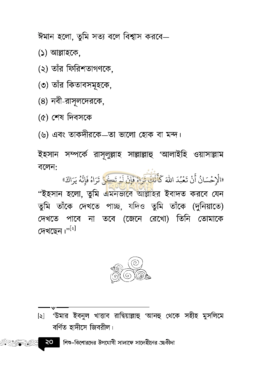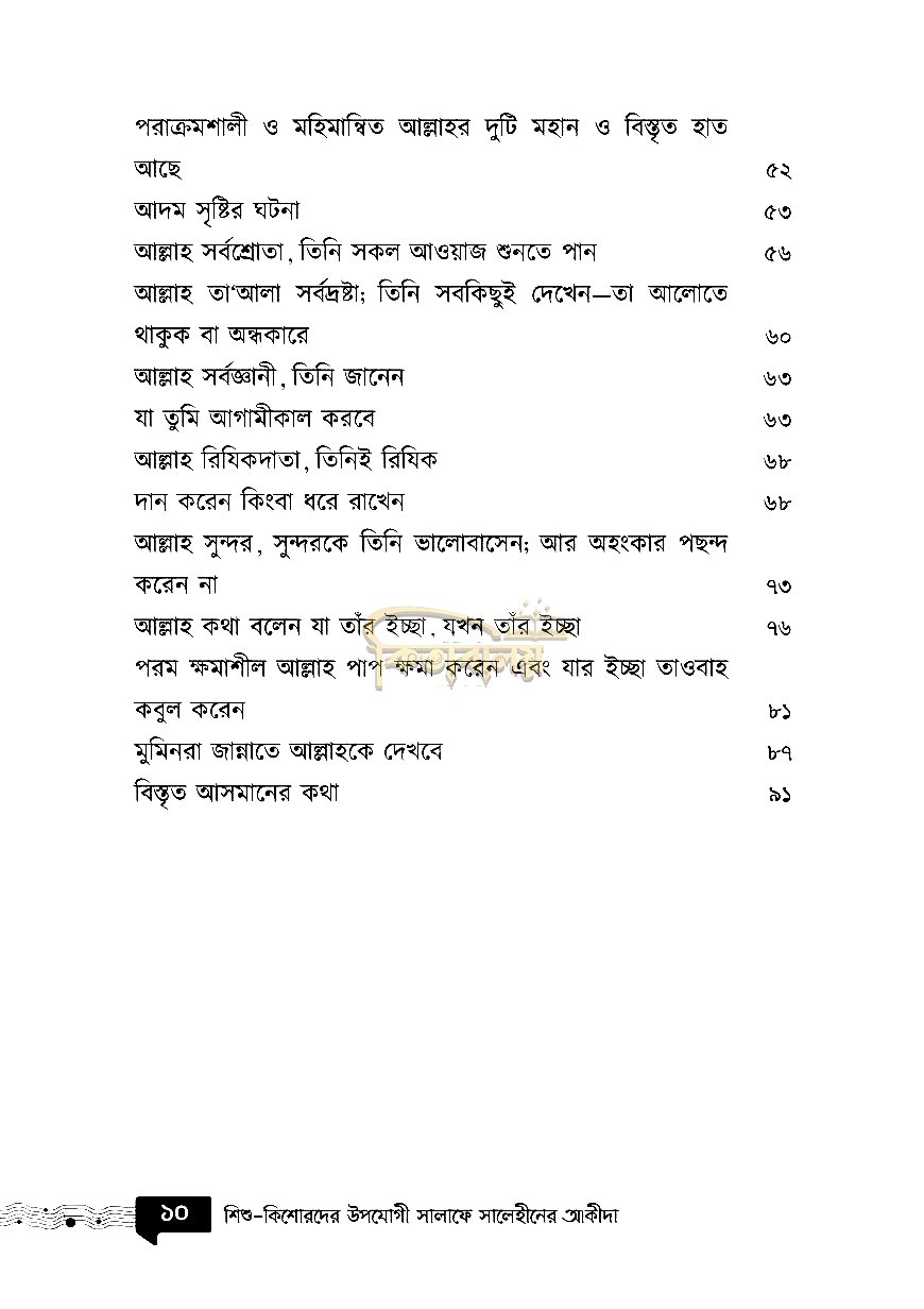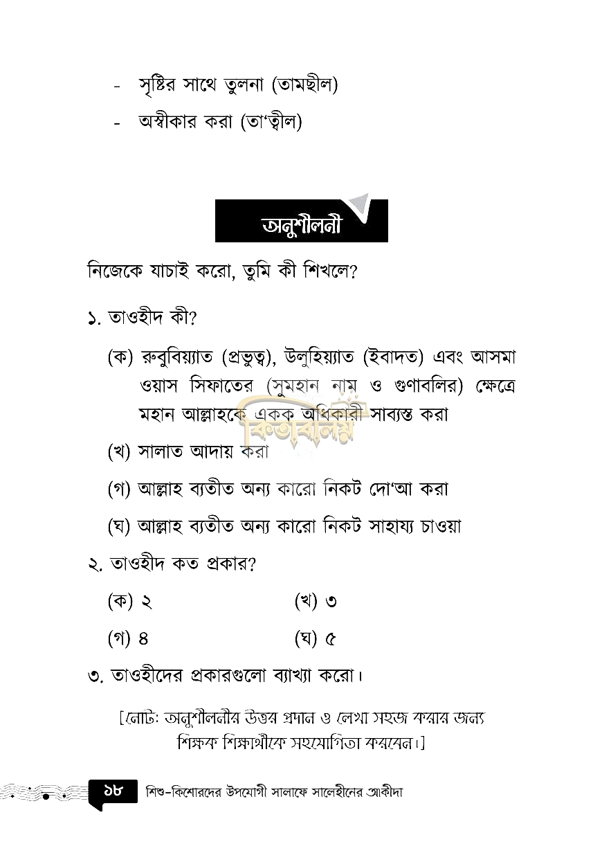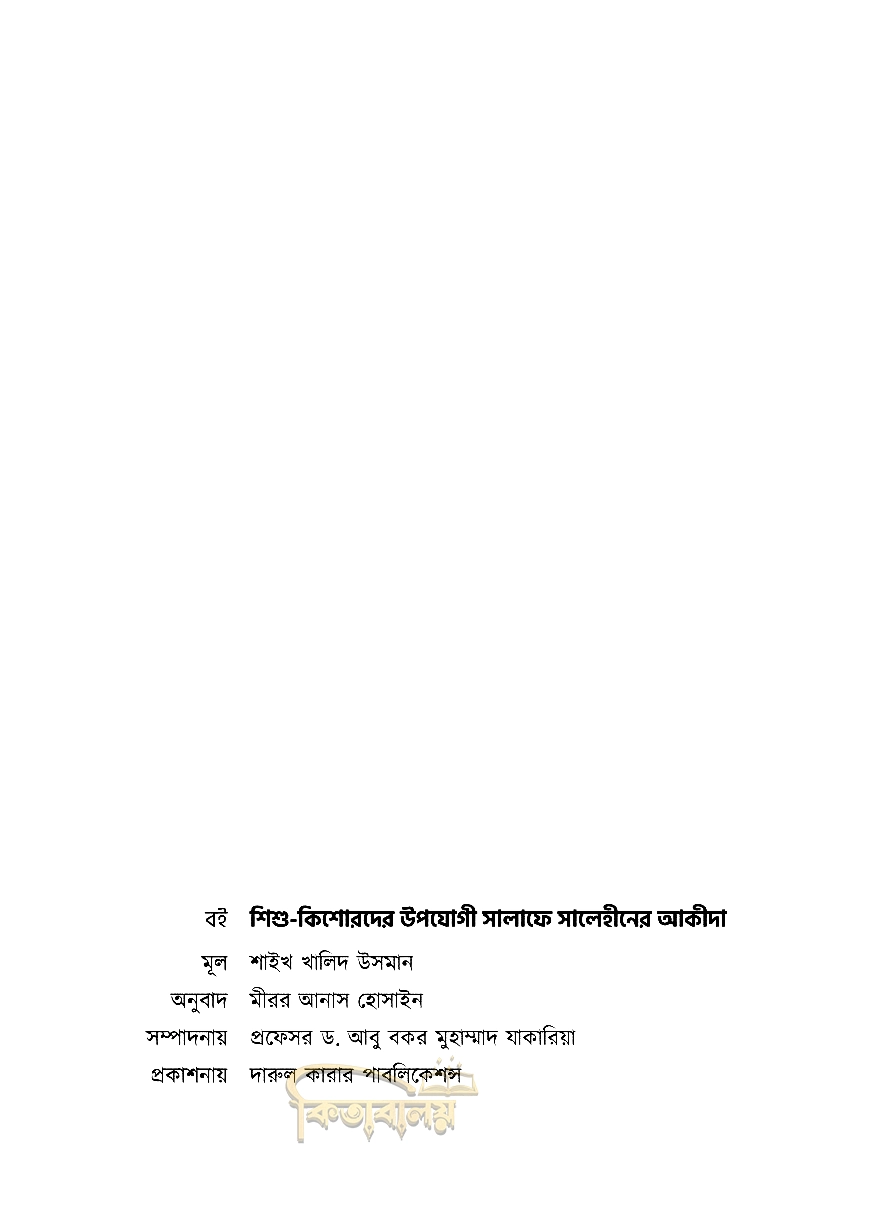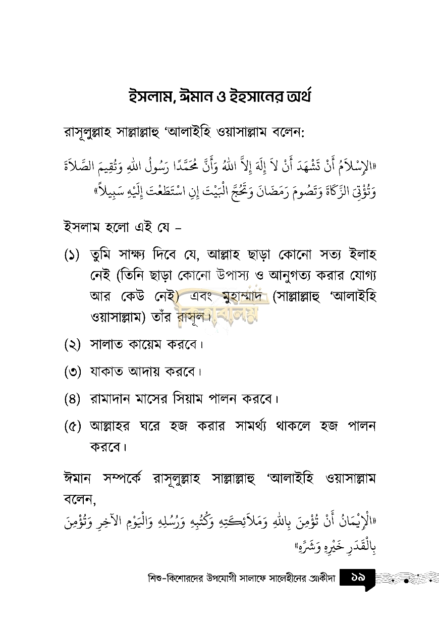 মহান আল্লাহ প্রতিটি মানবসন্তানের অন্তরে তাঁর তাওহীদের বীজ বুনে দিয়েছেন, যার ওপর সে বেড়ে উঠে। কিন্তু তার পিতা-মাতা, পরিবেশ, বন্ধু-বান্ধব, শিক্ষা-দীক্ষা, নাফসে আম্মারা ও বিতাড়িত শয়তান তাকে সে স্বাভাবিক প্রকৃতি থেকে বিচ্যুত করে দেয়। সন্তান-সন্ততিদেরকে এ বিচ্যুতি ও ধ্বংসের অতল গহ্বর থেকে বাঁচাতে হলে যথাযথ রোগ নির্ণয় করতে হবে, রোগের প্রতিষেধক খুঁজতে হবে এবং তার ঔষধের ব্যবস্থা করতে হবে। আজ আমাদের পরিবারগুলোতে নৈতিক শিক্ষা নেই বললেই চলে। আমাদের সমাজে নৈতিক শিক্ষার বিষয়টি উপেক্ষিত। শিক্ষায়তনগুলোতে তা শূন্যের কোটায় গিয়ে ঠেকেছে। তাই সন্তানরা কোথাও আদর্শ খুঁজে পাচ্ছে না। না তাদের পিতা-মাতার কাছে, না তাদের শিক্ষকদের কাছে। সন্তানরা অতি মাত্রায় প্রযুক্তি নির্ভর হয়ে পড়েছে। নিজের অজান্তেই তারা এমন সব বিষয় শিখছে যা তাদের বিশ্বাস ও ঈমানকে ক্ষতিগ্রস্ত করছে। তাদেরকে আদব ও শিষ্টাচার থেকে দূরে নিয়ে যাচ্ছে। কার্টুন ও রীল তাদেরকে বেহায়া বানিয়ে দিচ্ছে। তাদেরকে অপসংস্কৃতির সয়লাবে ভাসিয়ে দিচ্ছে। তারা ফালতু জিনিসে সময় নষ্ট করছে। জীবনকে উপভোগ করার নামে তাদেরকে জীবনের মূল্য বিসর্জন দিতে হচ্ছে। তাদেরকে দুনিয়ায় আসার মূল উদ্দেশ্য থেকে বিমুখ রাখা হচ্ছে। এ সময়ে সন্তানদেরকে দীনের গণ্ডিতে রাখা ও দীনকে তাদের কাছে প্রিয় করে তোলা চ্যালেঞ্জ হয়ে পড়েছে। তাদের জন্য যেসব গ্রন্থ রচনা করা হয়, যেসব নাটক-নভেল তারা চোখ দিয়ে দেখে থাকে সে সবের মধ্যে দীন ও দীনকে খারাপভাবে চিত্রায়িত করা হয়। তারা কোনোভাবেই দীন ও আকীদাকে সুন্দরভাবে নিতে সক্ষম হচ্ছে না। আকাশ সংস্কৃতির নামে যেসব অপসংস্কৃতি চালু আছে তাতে কী পরিমাণ শির্ক, বিদ‘আত, কুফর, নিফাকের অনুপ্রবেশ শিশু ও কিশোরদের অন্তরে প্রবেশ করছে তার হিসাব কে রাখে? দীনকে ধরে রাখা এখন যেন সত্যিই জ্বলন্ত অঙ্গারকে ধরে রাখার মতো হয়ে দাঁড়িয়েছে। এ সময়ে দীনের ওপর ঠিকে থাকা কত যে দুষ্কর তা কেবল একজন দীনদার ও দা‘ঈ ব্যক্তি হাড়ে হাড়ে অনুভব করতে পারেন। কিন্তু বিপদ ও ফিতনা যত বড়ই হোক না কেন, হতাশ হওয়া যাবে না। সকলের উচিত সে ফিতনাকে শরী‘আতের নির্দেশনার মধ্যে অবস্থান করে প্রতিহত করার চেষ্টা চালিয়ে যাওয়া। সন্তানদেরকে বিপদ ও ফিতনার মুখ থেকে ফিরিয়ে আনতে যার যতটুকু সামর্থ্য আছে তা ব্যয় করা। সেজন্য আমাদেরকে প্রচুর পরিমাণে শিশুতোষ সাহিত্য ও শিশু-কিশোদের উপযোগী রচনায় মনোনিবেশ করা। আলোচ্য গ্রন্থটি শিশু-কিশোর উপযোগী একটি আকীদার গ্রন্থ, যা একটি শিশুকে আল্লাহর ঈমানের দিকে, ইবাদতের দিকে ও আদব-আখলাকের দিকে পথ দেখাবে; অনুরূপ কিশোরদেরকে সঠিক পথে চলতে সহায়তা করবে বলে আমার বিশ্বাস। শিশু কিশোরদের উপযোগী সালাফে সালেহীনের আক