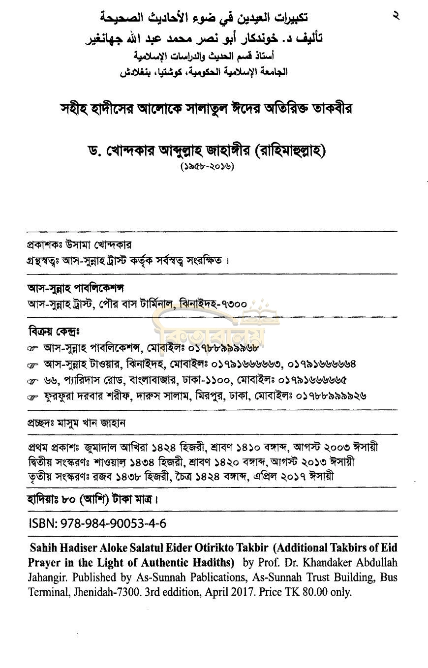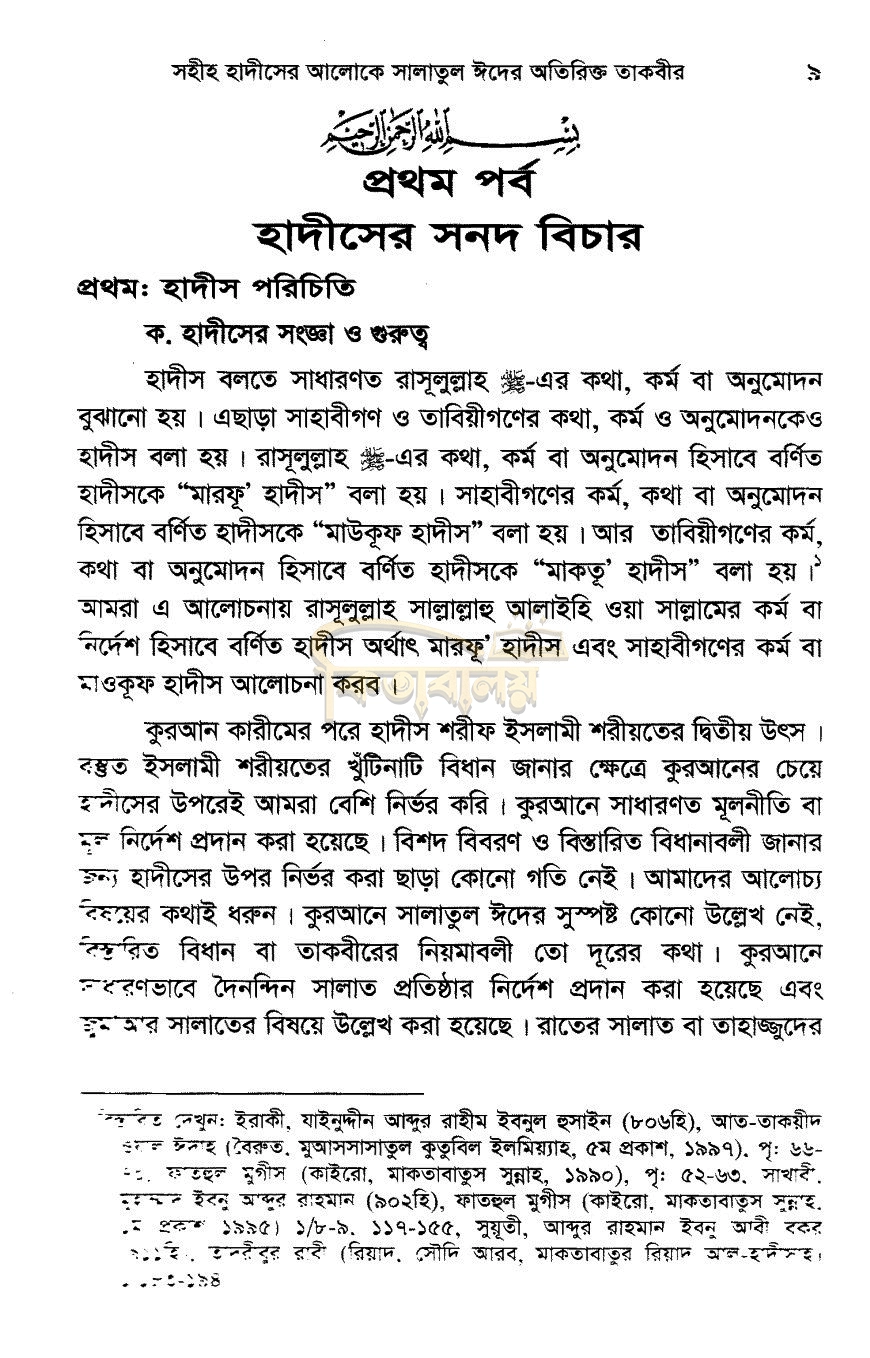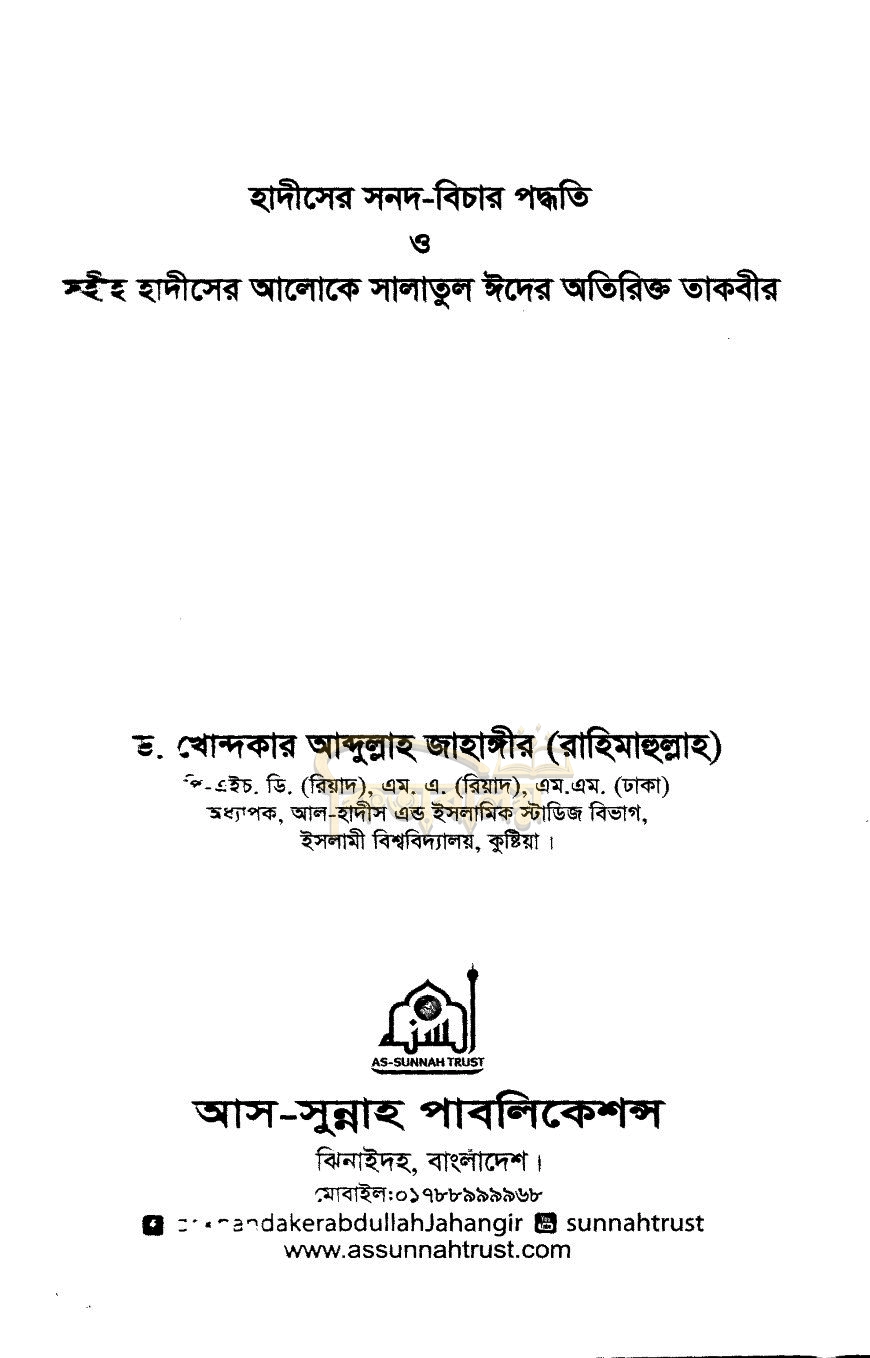 আমার জ্ঞানের পরিধি খুবই সীমিত। কিন্তু পেশাগত কারণে আমি যেহেতু বিশ্ববিদ্যালয়ে “হাদীস” বিভাগে শিক্ষকতা করি এবং সমাজের অনেকে আমাকে “আলিম” বলে মনে করেন, সেহেতু আমার ছাত্ররা এবং সমাজের বিভিন্ন স্তরের দ্বীনদার মুসলিম বিভিন্ন সময়ে সালাতুল ঈদের তাকবীরের বিষয়ে আমাকে বারংবার প্রশ্ন করেছেন। কেউ প্রশ্ন করেছেন: আপনারা সালাতুল ঈদের ৬ তাকবীর কোথায় পেয়েছেন?…..বিস্তারিত জানতে বইটি পড়ুন