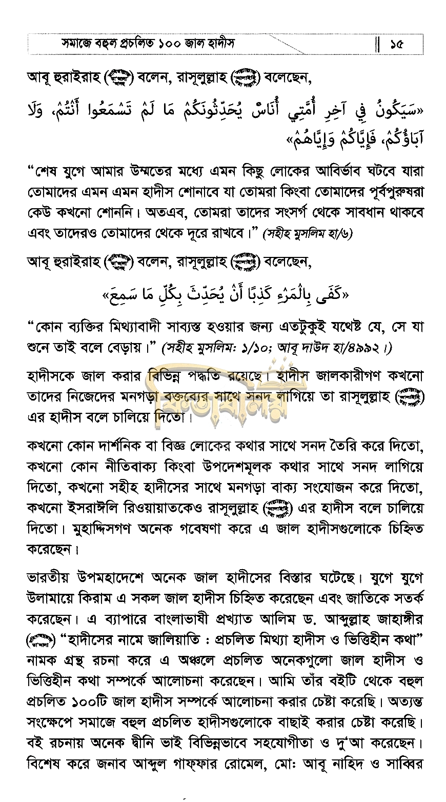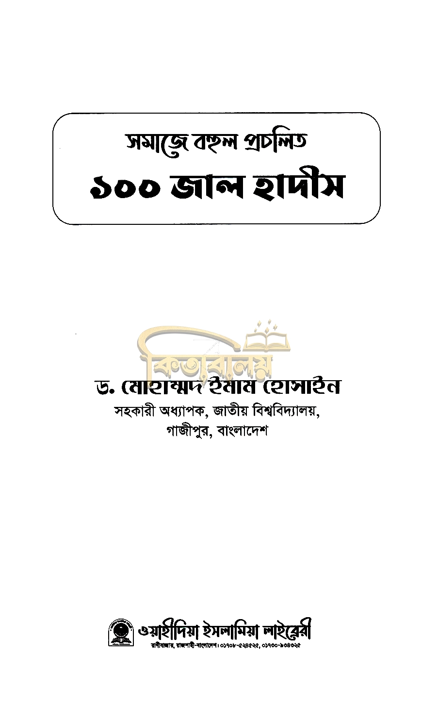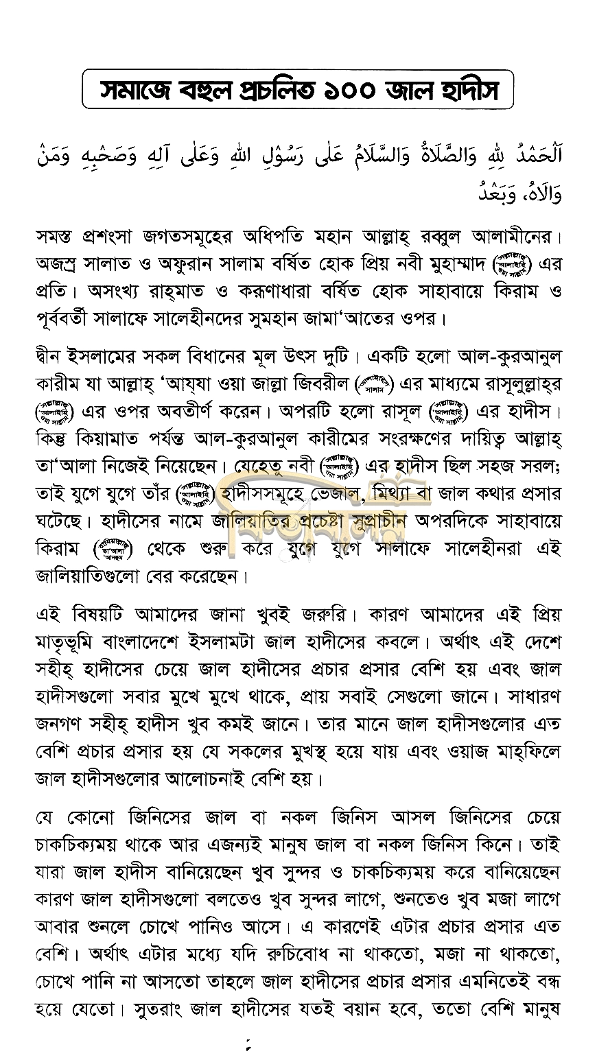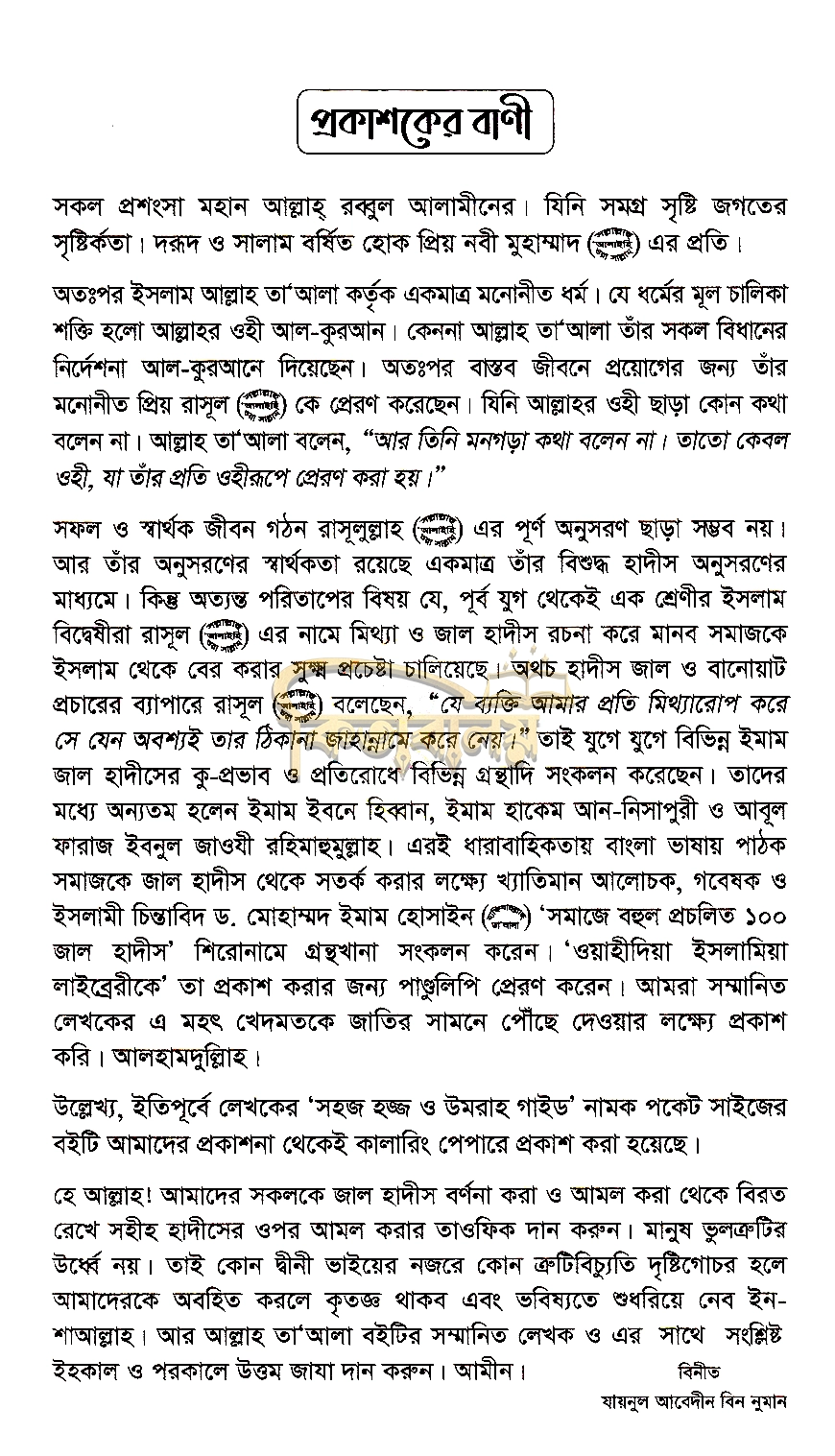 সফল ও স্বার্থক জীবন গঠন রাসূলুল্লাহ (ছাঃ) এর পূর্ণ অনুসরণ ছাড়া সম্ভব নয়। আর তার অনুসরণের স্বার্থকতা রয়েছে একমাত্র তার বিশুদ্ধ হাদীস অনুসরণের মাধ্যমে। কিন্তু অত্যন্ত পরিতাপের বিষয় যে, পূর্ব যুগ থেকেই এক শ্রেণীর ইসলাম বিদ্বেষীরা রাসূল (ছাঃ)-এর নামে মিথ্যা ও জাল হাদীস রচনা করে মানব সমাজকে ইসলাম থেকে বের করার সুক্ষ্ম প্রচেষ্টা চালিয়েছে। অথচ হাদীস জাল ও বানােয়াট প্রচারের ব্যাপারে রাসূল (ছাঃ) বলেছেন, “যে ব্যক্তি আমার প্রতি মিথ্যারােপ করে। সে যেন অবশ্যই তার ঠিকানা জাহান্নামে করে নেয়। তাই যুগে যুগে বিভিন্ন ইমাম জাল হাদীসের কু-প্রভাব ও প্রতিরােধে বিভিন্ন গ্রন্থাদি সংকলন করেছেন। তাদের। মধ্যে অন্যতম হলেন ইমাম ইবনে হিব্বান, ইমাম হাকেম আন-নিসাপুরী ও আকূল। ফারাজ ইবনুল জাওযী রহিমাহুমুল্লাহ। এরই ধারাবাহিকতায় বাংলা ভাষায় পাঠক সমাজকে জাল হাদীস থেকে সতর্ক করার লক্ষ্যে খ্যাতিমান আলােচক, গবেষক ও ইসলামী চিন্তাবিদ ড. মােহাম্মদ ইমাম হােসাইন (হাফিযাহুল্লাহ তা’আলা) সমাজে বহুল প্রচলিত ১০০ জাল হাদীস’ শিরােনামে গ্রন্থখানা সংকলন করে। আলহামদুল্লিাহ।