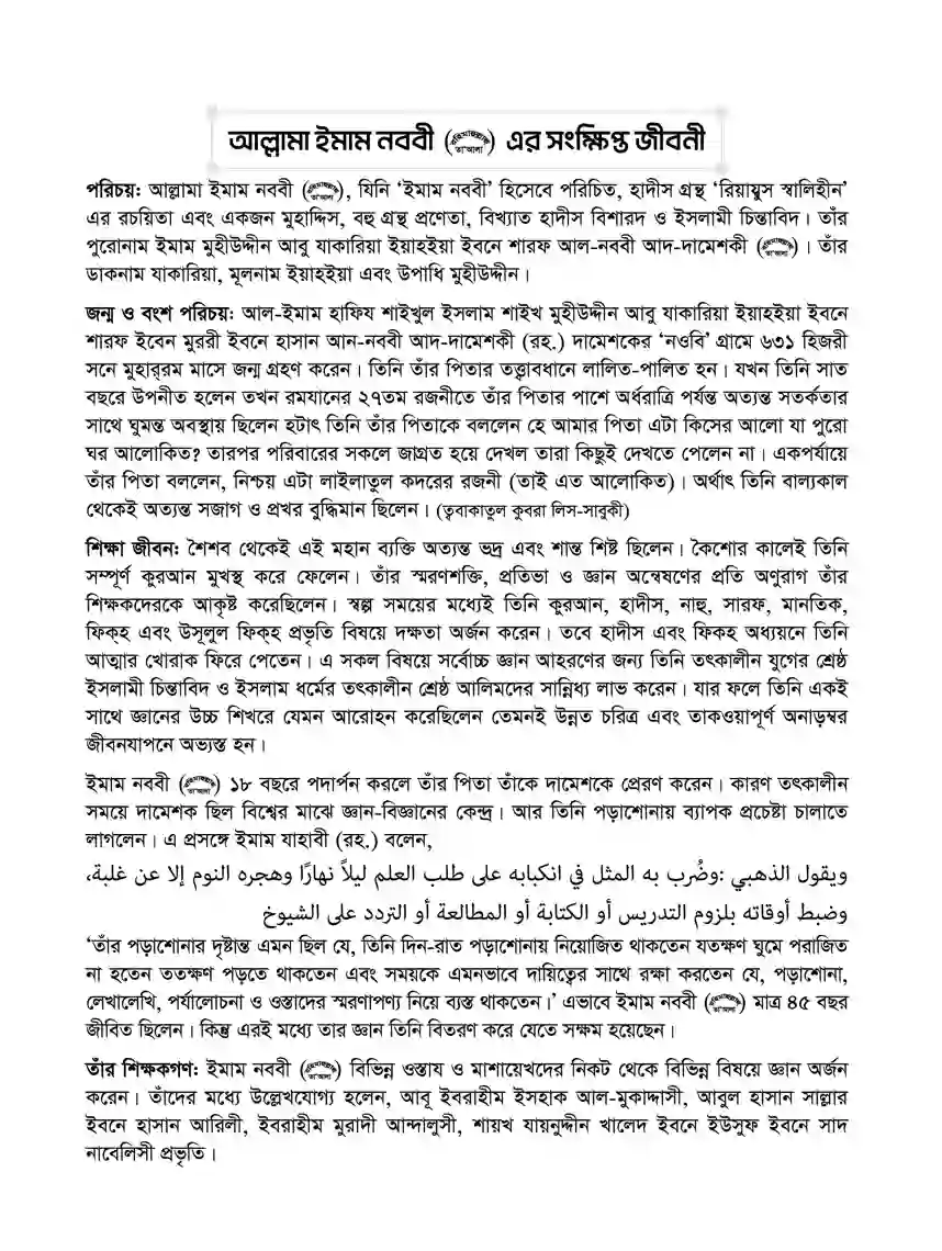 ‘রিয়ায্বুস স্বা-লিহীন’ আর ‘ইমাম নববী’ রহ. যেন একে অপরের সমার্থক। এই বইকে নতুন করে পরিচয় করিয়ে দেওয়ার কিছু নেই। বলা হয়ে থাকে কুরআনের পর সবচেয়ে বেশী ছাপানো কিতাবের নাম রিয়াযুস সালেহীন। আল্লাহ ইমাম নববীকে রহ. জান্নাতুল ফেরদৌস দান করুন।