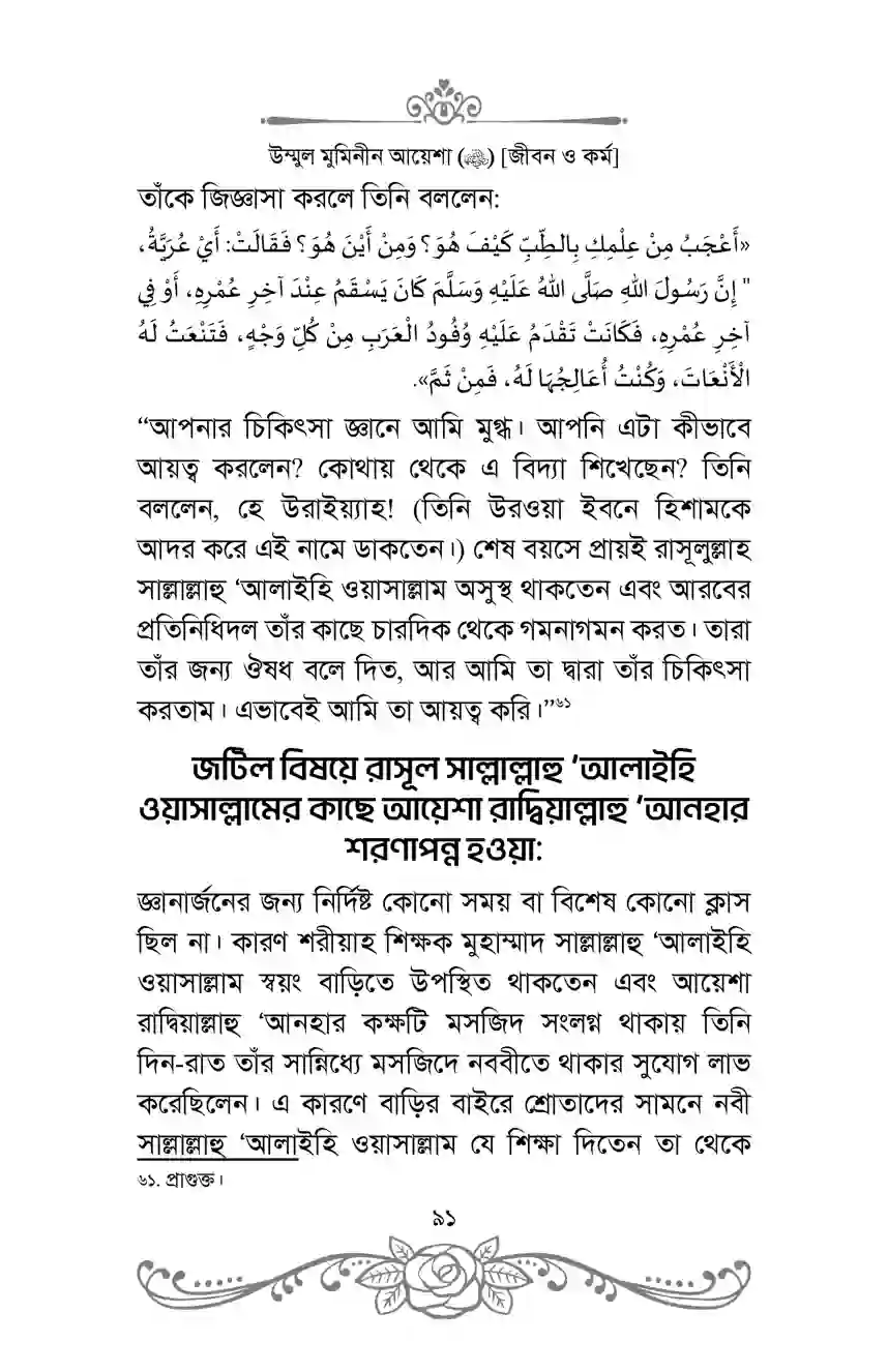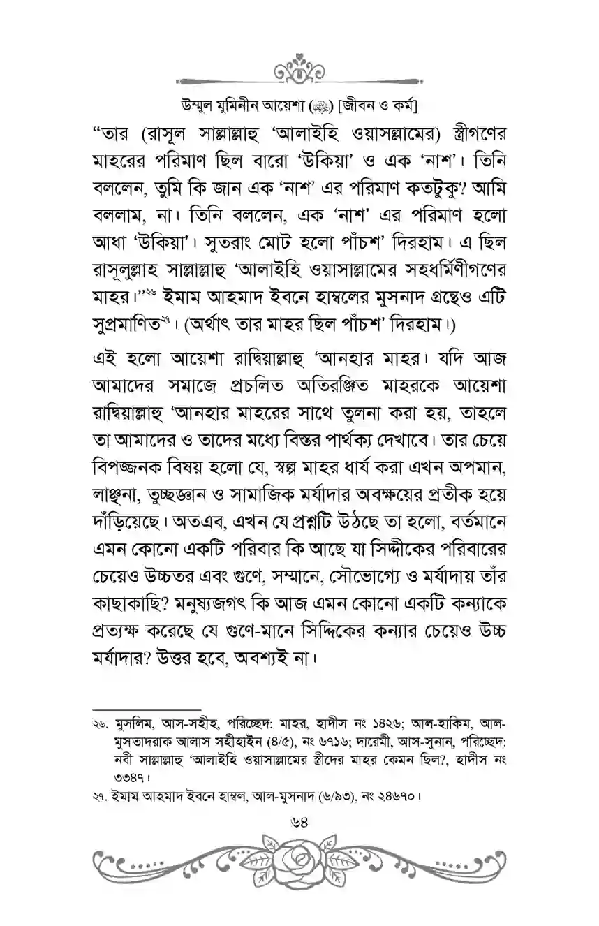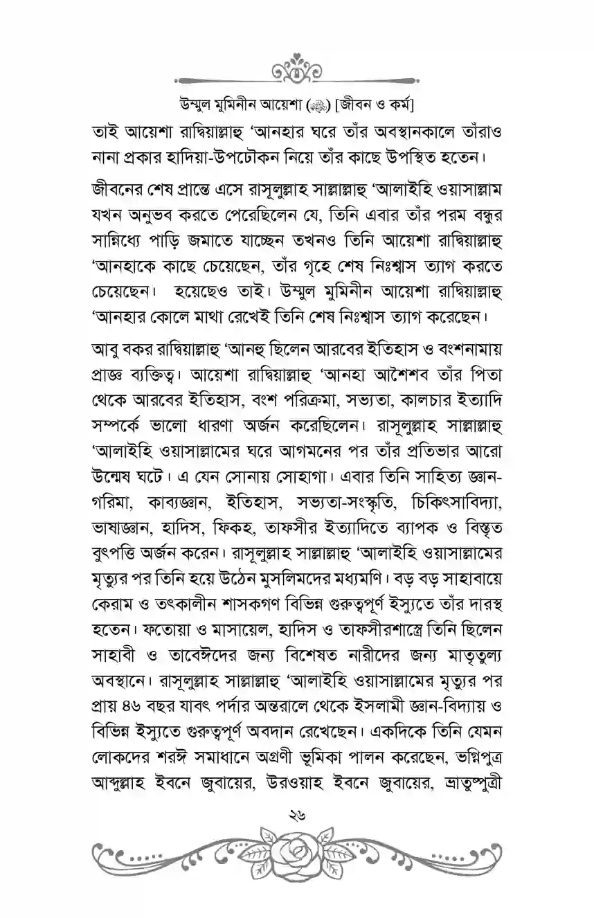 এটি কেবল একটি জীবনীগ্রন্থ নয়; বরং এটি ইতিহাস, জ্ঞান-বিজ্ঞান, সাহিত্য, দীনদারি ও একজন নারীর অনন্যসাধারণ অবদান সম্পর্কিত তথ্যভাণ্ডার। এই গ্রন্থটি নারীদের জন্য বিশেষভাবে গুরুত্বপূর্ণ। আয়েশা রাদ্বিয়াল্লাহু ‘আনহার জীবনচরিত প্রমাণ করে, ইসলামে নারীর ভূমিকা শুধুমাত্র গৃহকোণে আবদ্ধ নয়; বরং তারা শরীয়তের গণ্ডির ভেতর থেকে সর্বক্ষেত্রে ব্যাপক ভূমিকা পালন করতে পারে।