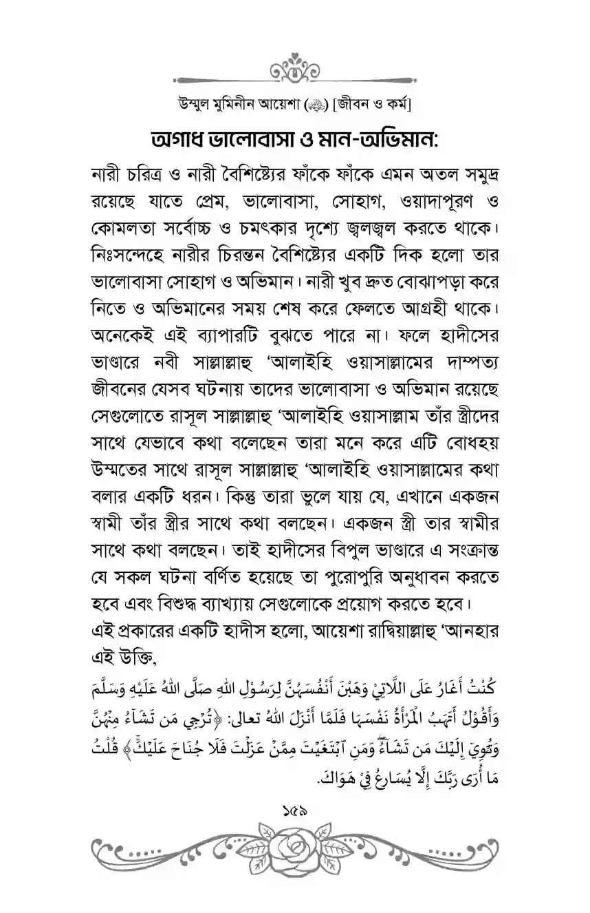 আয়েশা সিদ্দীকা রাদ্বিয়াল্লাহু ‘আনহা ছিলেন নববী কাননের সেই ফুল যার অপূর্ব সুবাস নবী সাল্লাল্লাহু ‘আলাইহি ওয়াসাল্লামকে সর্বদা মোহিত ও মাতোয়ারা করে রাখতেন। তিনি ছিলেন নববী সংসারের সেই জ্যোতি যিনি তাঁর উজ্জ্বল জ্যোতিতে রাসূলুল্লাহ সাল্লাল্লাহু ‘আলাইহি ওয়াসাল্লামের দাম্পত্য সংসারকে সদা আনন্দময় ও পুলকিত করে রাখতেন। রাসূলুল্লাহজপ সাল্লাল্লাহু ‘আলাইহি ওয়াসাল্লাম তাই ভালোবেসে আদর করে তাঁকে ডাকতেন ‘হুমায়রা’। তিনি স্বউচ্ছ্বাসে বলতেন: “নারীদের ওপর আয়েশার মর্যাদা এমন, সকল প্রকার খাদ্যের ওপর সারীদের মর্যাদা যেমন।” [বুখারী: ৩৪১১]