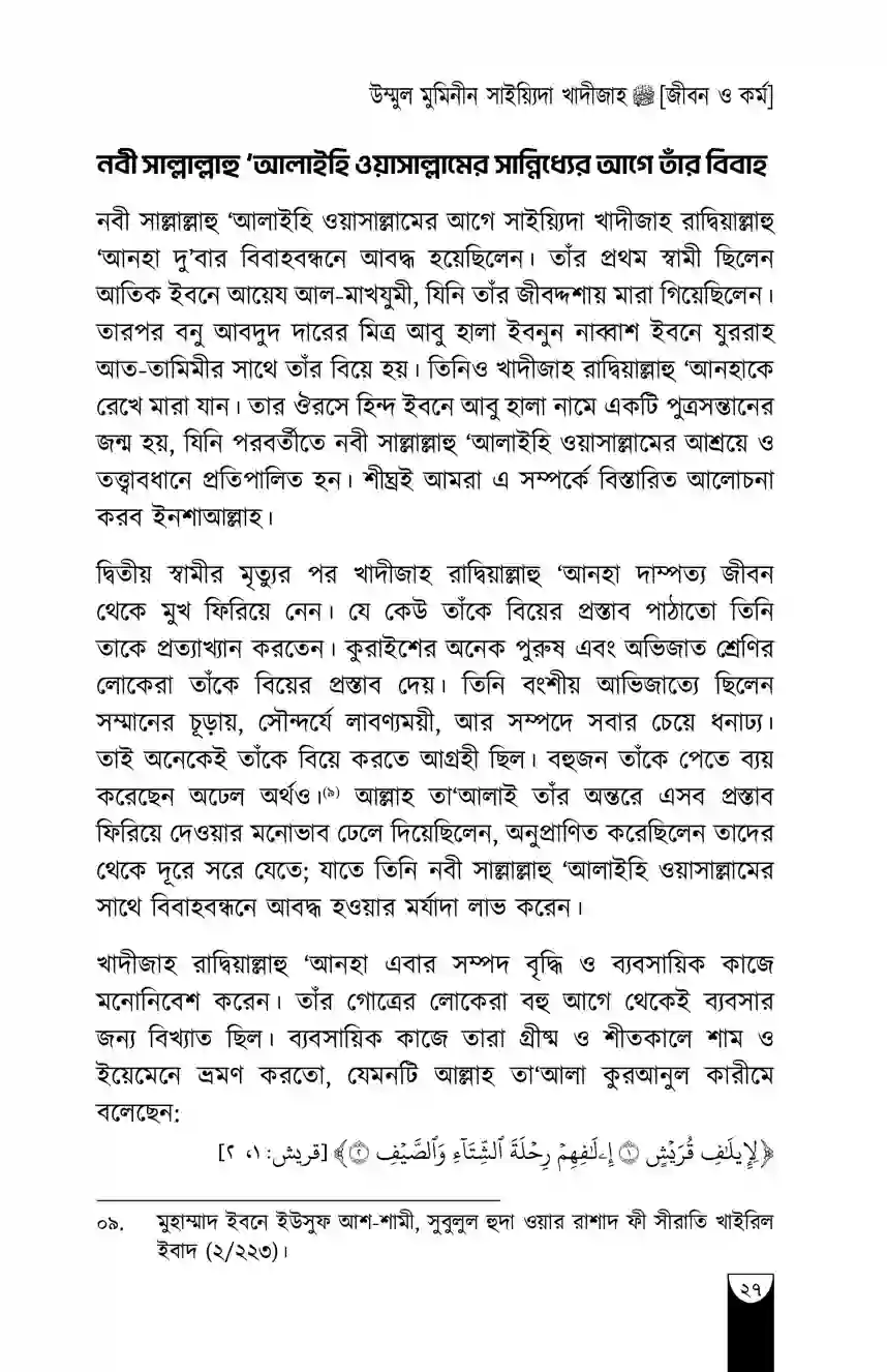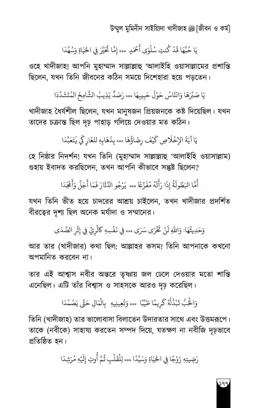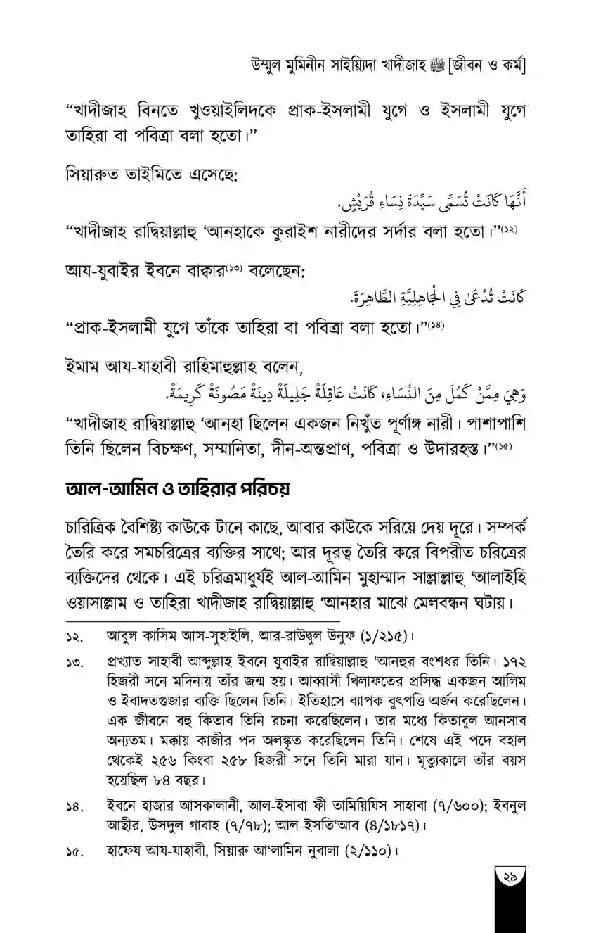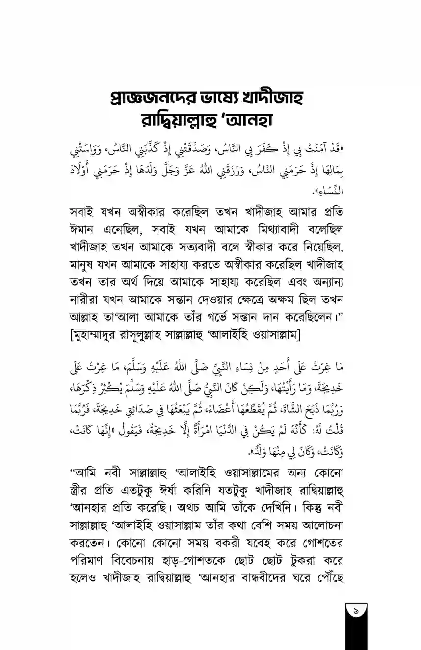 “খাদীজাহ রাদিয়াল্লাহু ‘আনহা ছিলেন একজন নিখুঁত পূর্ণাঙ্গ নারী। পাশাপাশি তিনি ছিলেন বিচক্ষণ, সম্মানিতা, দীন-অন্তপ্রাণ, পবিত্রা ও উদারহস্ত।”