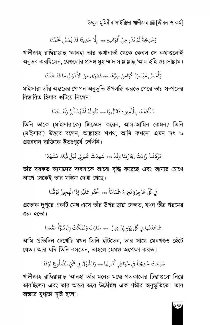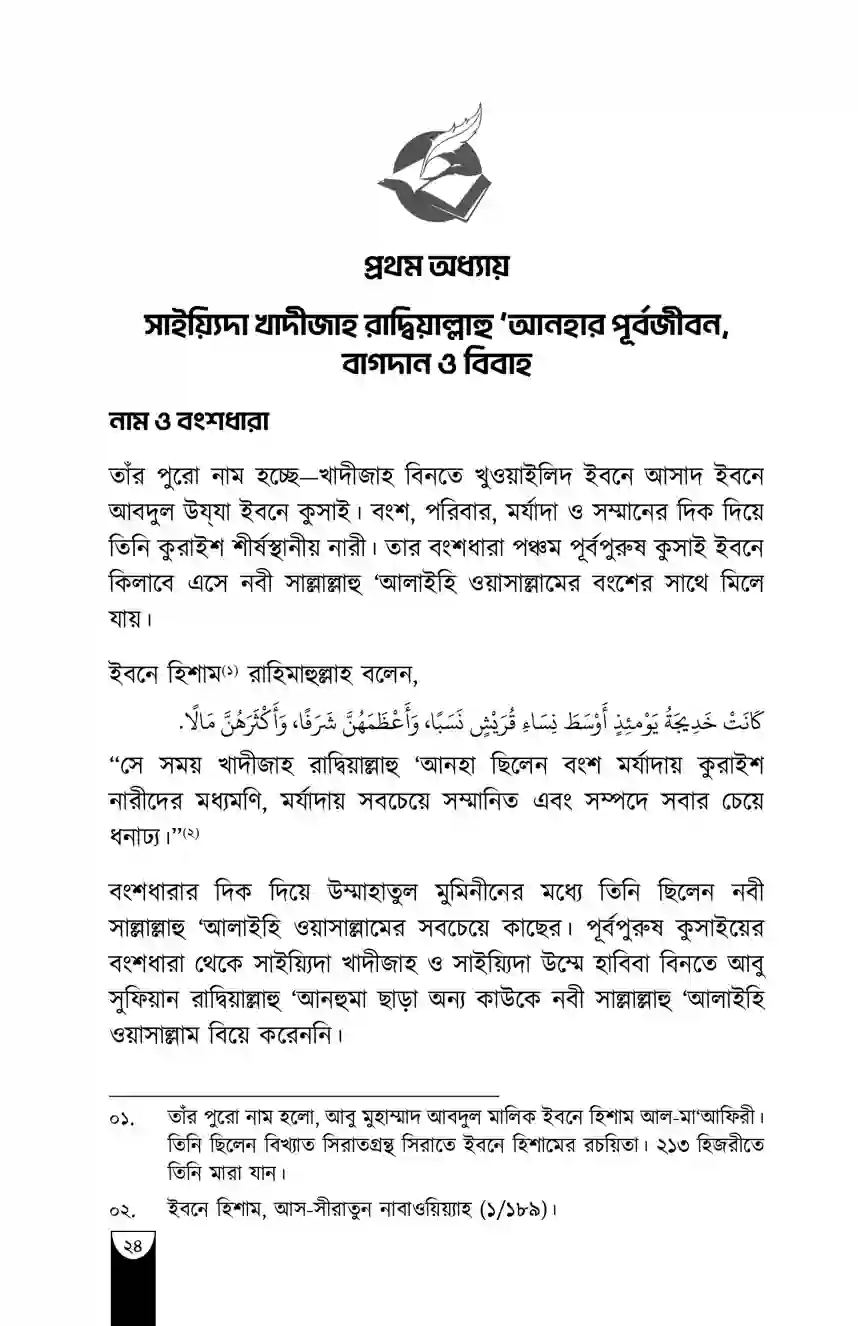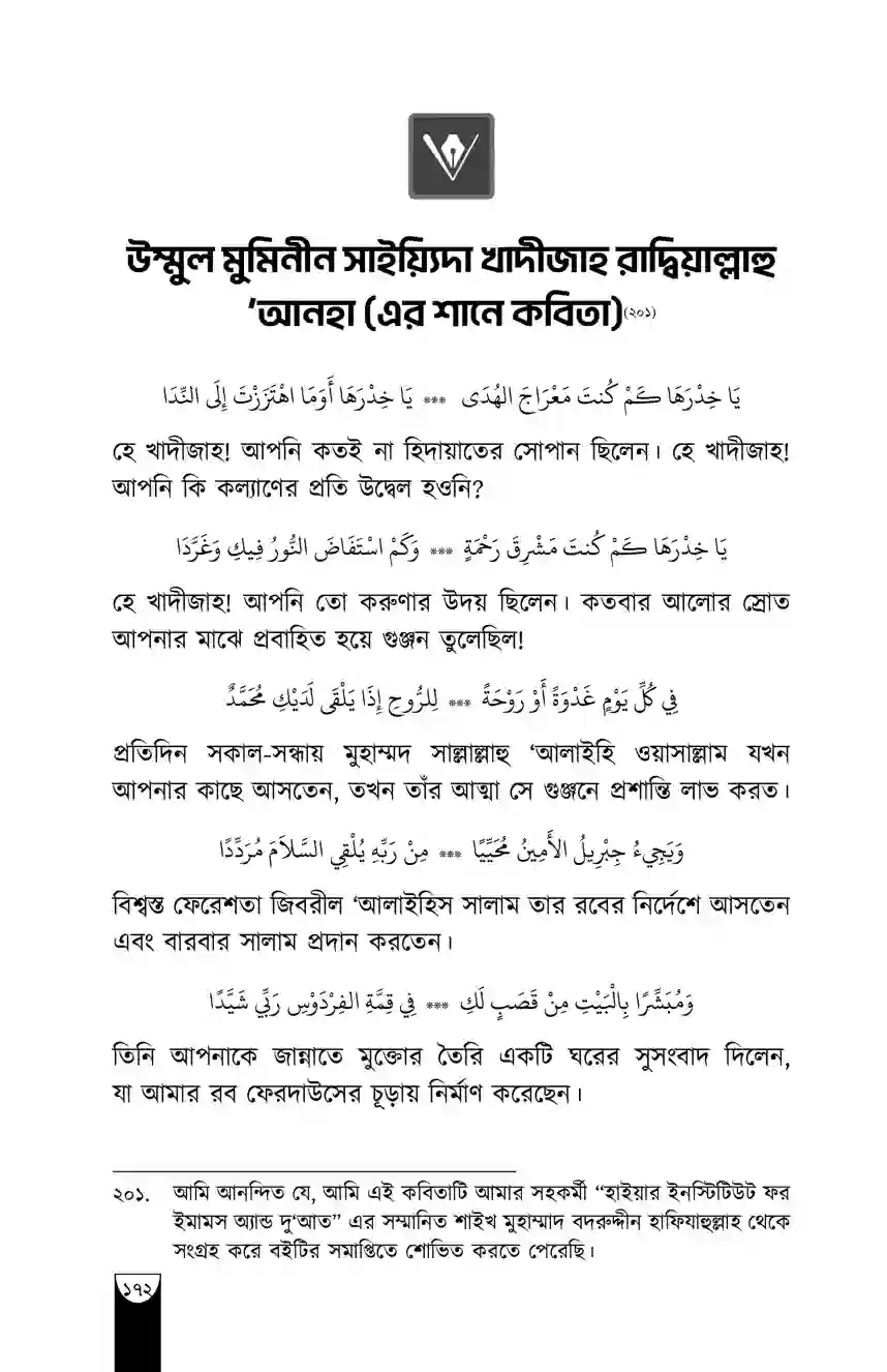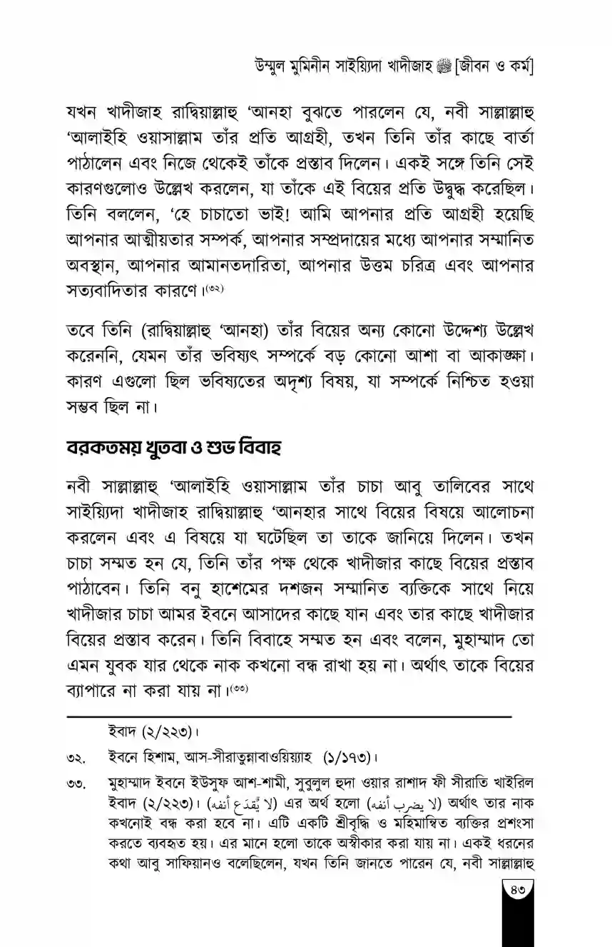 “খাদীজাহ রাদিয়াল্লাহু ‘আনহা ছিলেন একজন নিখুঁত পূর্ণাঙ্গ নারী। পাশাপাশি তিনি ছিলেন বিচক্ষণ, সম্মানিতা, দীন-অন্তপ্রাণ, পবিত্রা ও উদারহস্ত।”