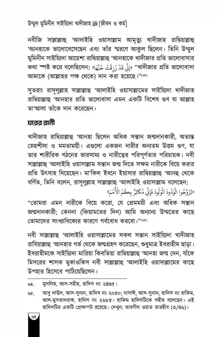 তিনি (সাল্লাল্লাহু আলাইহি ওয়াসাল্লাম) বলতেন, “তুমি জানো না, খাদীজাহ কেমন ছিলেন! তিনি এমন-তেমন ছিলেন না। তিনি আমাকে সহানুভূতি দিয়েছেন, আমার সন্তানদের জননী হয়েছেন।”