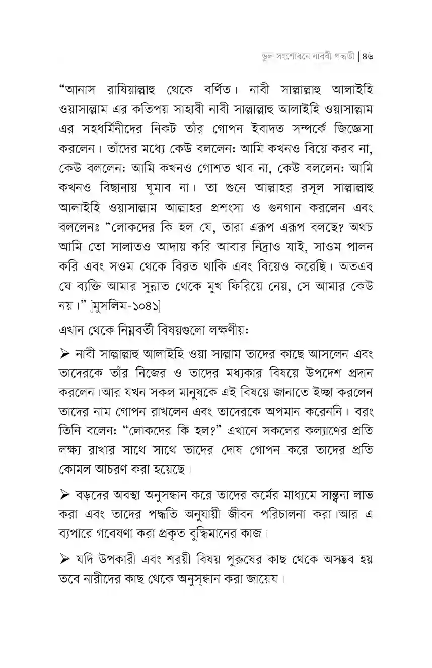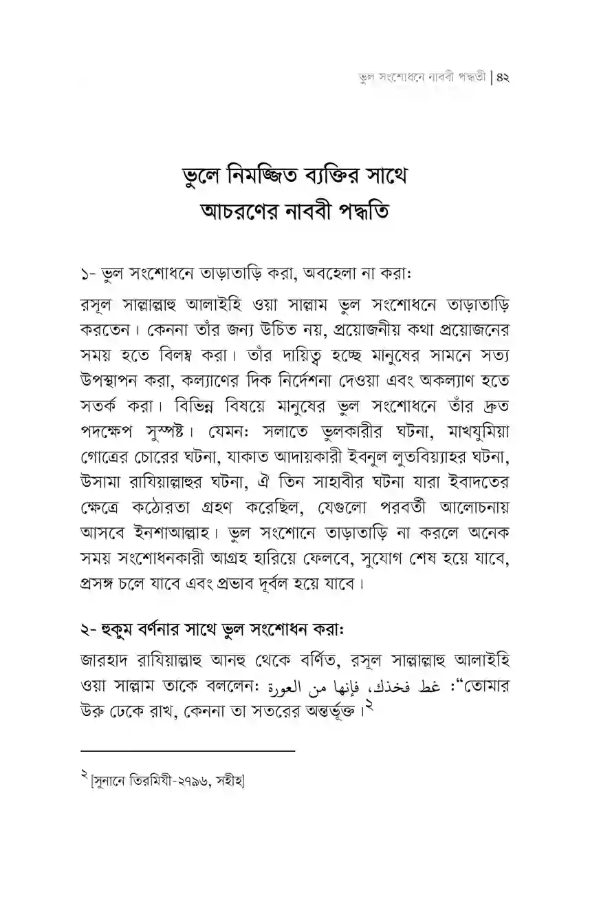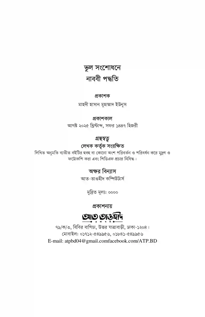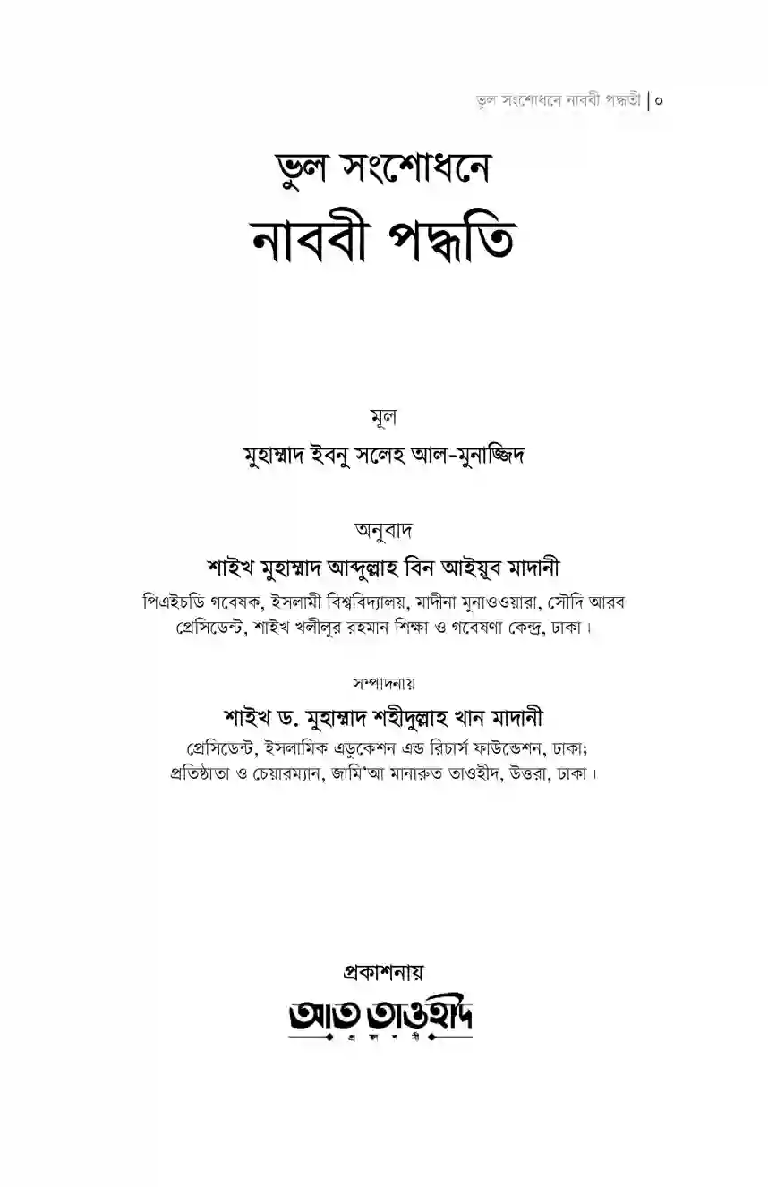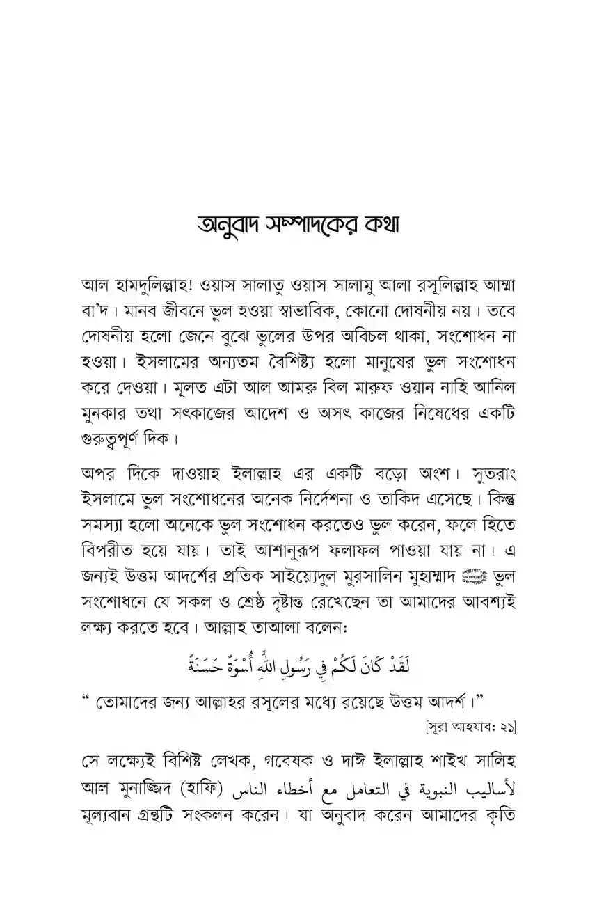 ভুলত্রুটি মানুষের স্বভাবজাত। কাদবা অজ্ঞাতসারে মানুষ মাত্রই ভুল করে থাকে। রাসূলুল্লাহ (ছা:) বলেছেন, ‘প্রত্যেক আদম সন্তান ভুল কারি। আর সর্বোত্তম ভুলকারী সেই যে তওবা করে’ (তিরমিজি হা/২৪৯৯ মিশকাত হা/২৩৪১)।ভুলের মধ্যে নিমজ্জিত মানুষের ভুল সংশোধন করে তাকে সঠিক পথে ফিরিয়ে আনা অত্যান্ত গুরুত্বপূর্ণ বিষয়। গুরুত্বপূর্ণ এ পুস্তকের সম্মানিত লেখক মানুষের ভুল ত্রুটি সংশোধনে রাসূলুল্লাহ (ছা:) কর্তৃক অনুসৃত পদ্ধতি প্রামাণ্য দলিল প্রমান সহ সংক্ষেপে সাবলীল ভাষায় আলোচনা করেছেন।